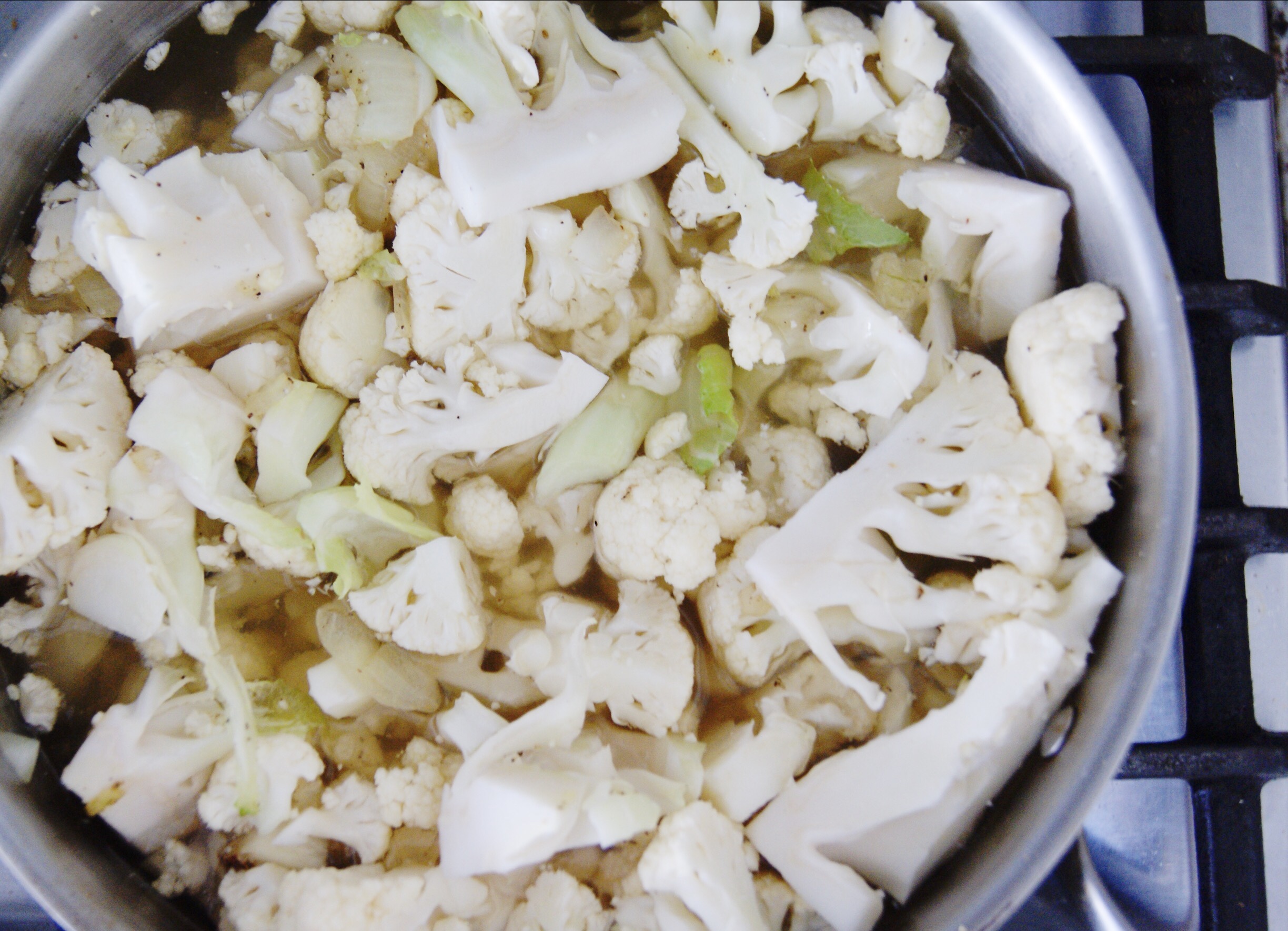 Add cauliflower and broth and bring to a boil on medium heat then reduce to low cover and simmer for approximately 20 minutes.