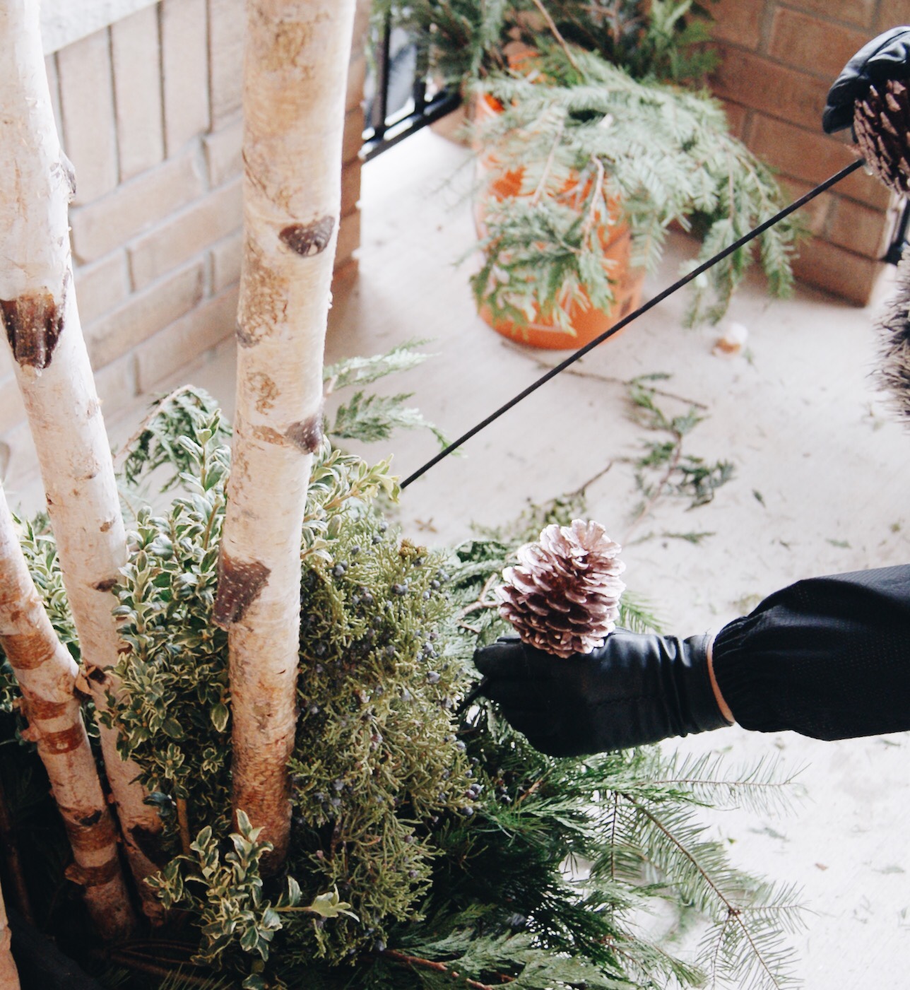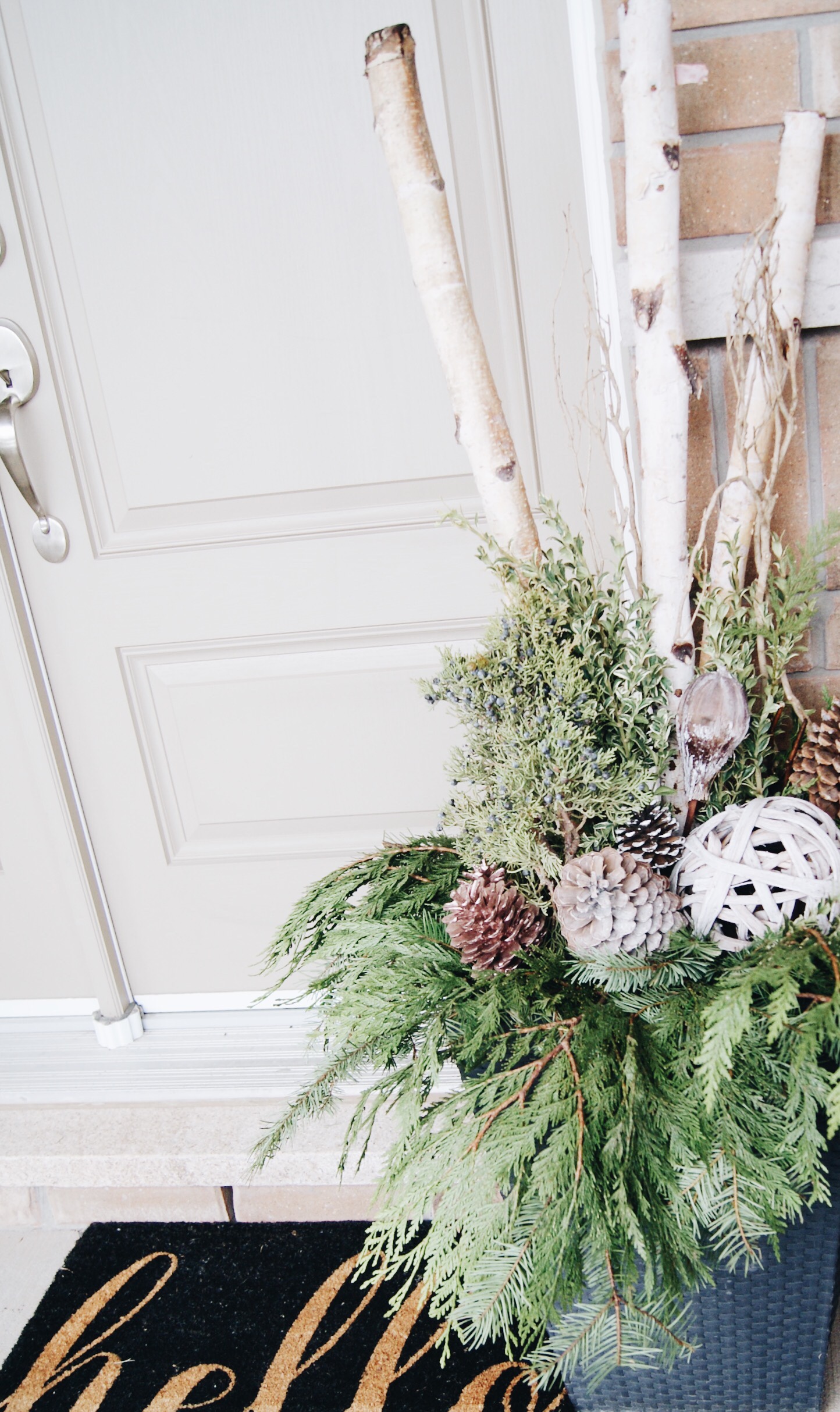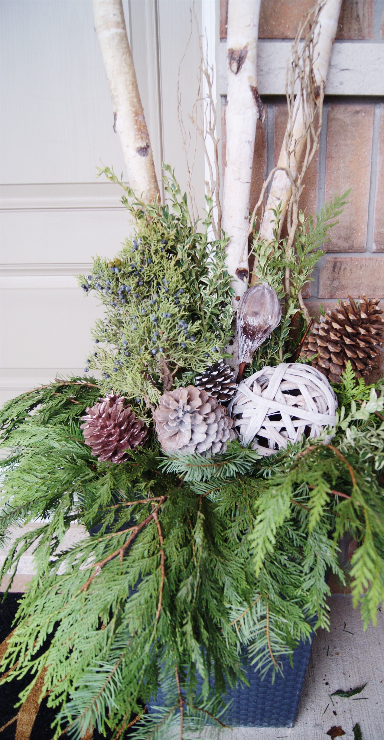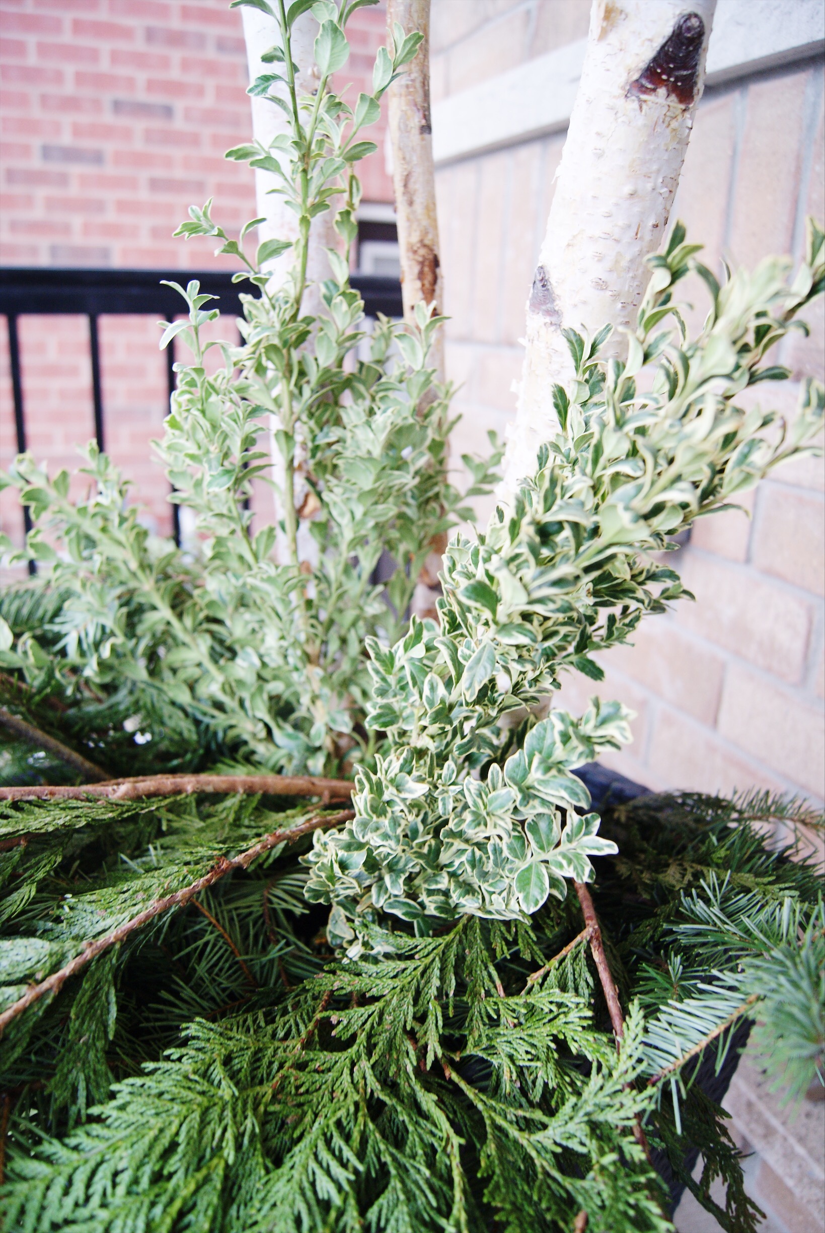 My approach to decorating on the exterior of the house is similar to how I ‘deck the halls’ on the inside. For me, it’s all about winter inspiration. I always do my planters first. They are kept out all year long and switch them up with every season change. If you don’t have planters I would suggest investing in neutral ones that compliment your home. Sure, you could spend a fortune and purchase prearranged planters. But where’s the fun in that? Making your own is cheaper and you can get creative and add your own personal style. Here’s my go to formula for building your own winter planters.