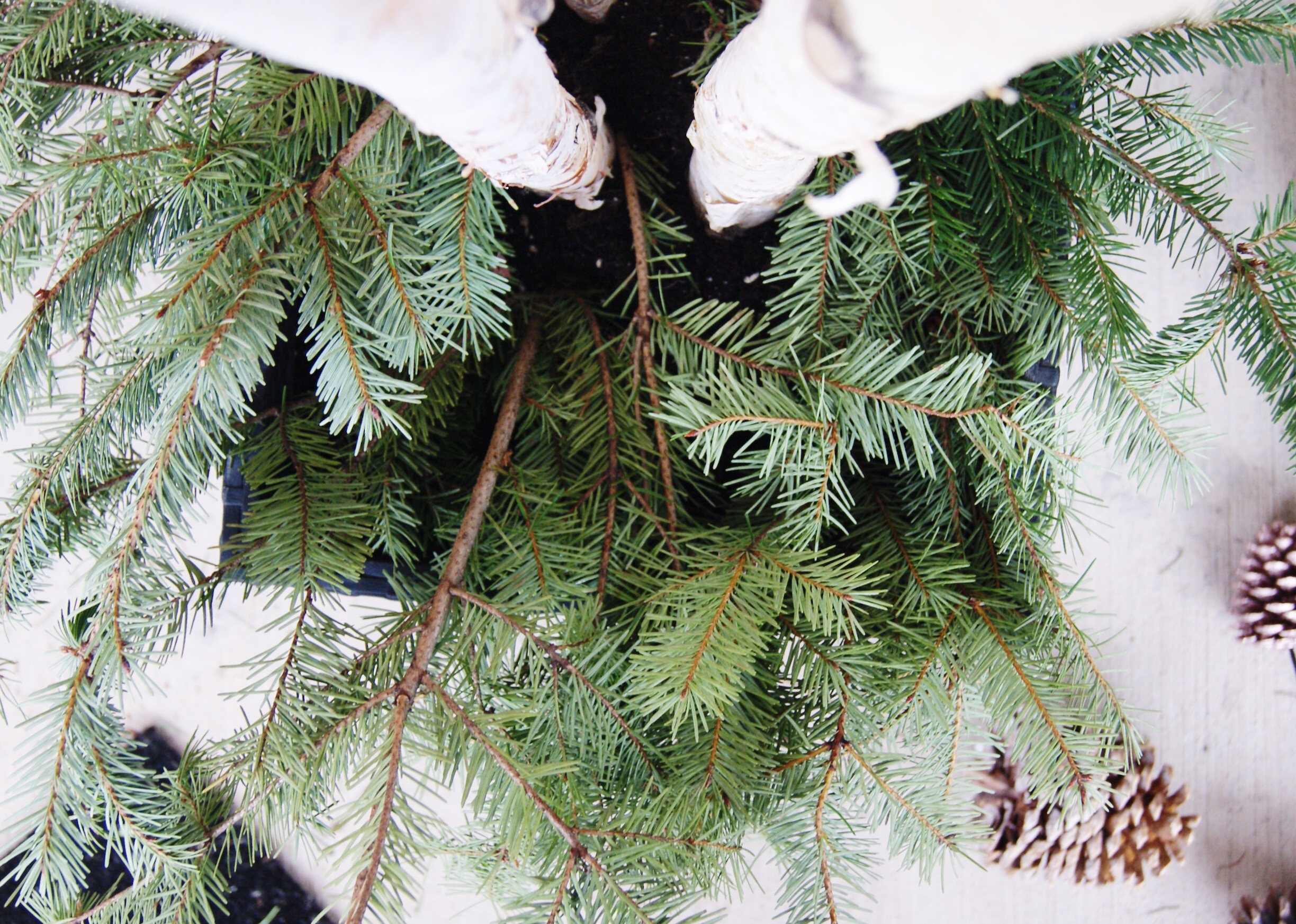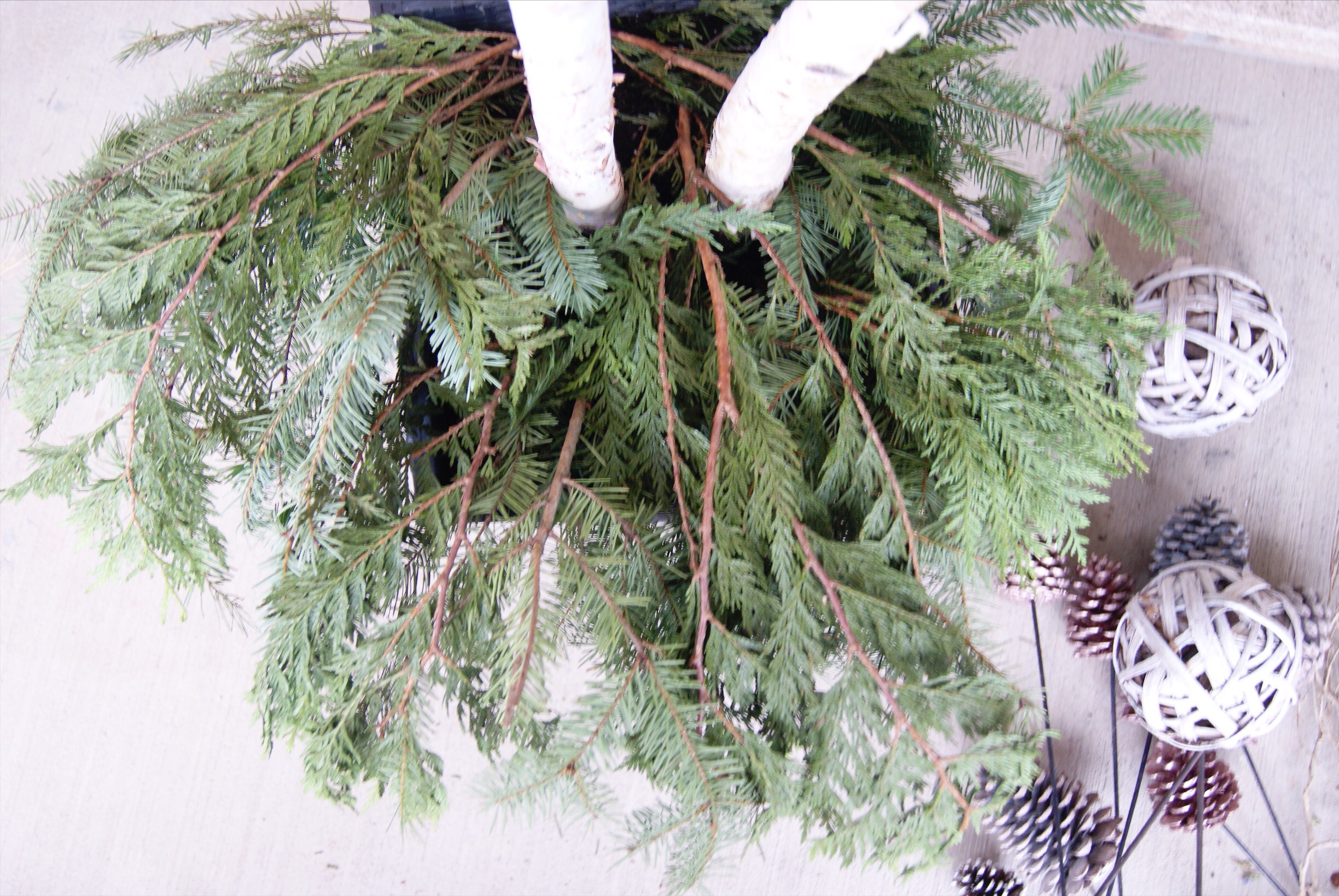 Adding the greenery. I add the fresh greens in layers starting with the fir or pine. It’s not so pretty and it’s very hearty so provides a good base. Poke the ends directly into the soil so they keep longer and won’t move.