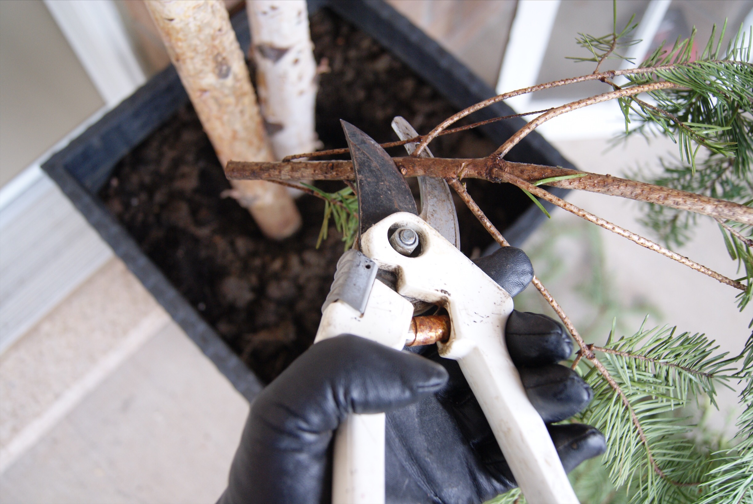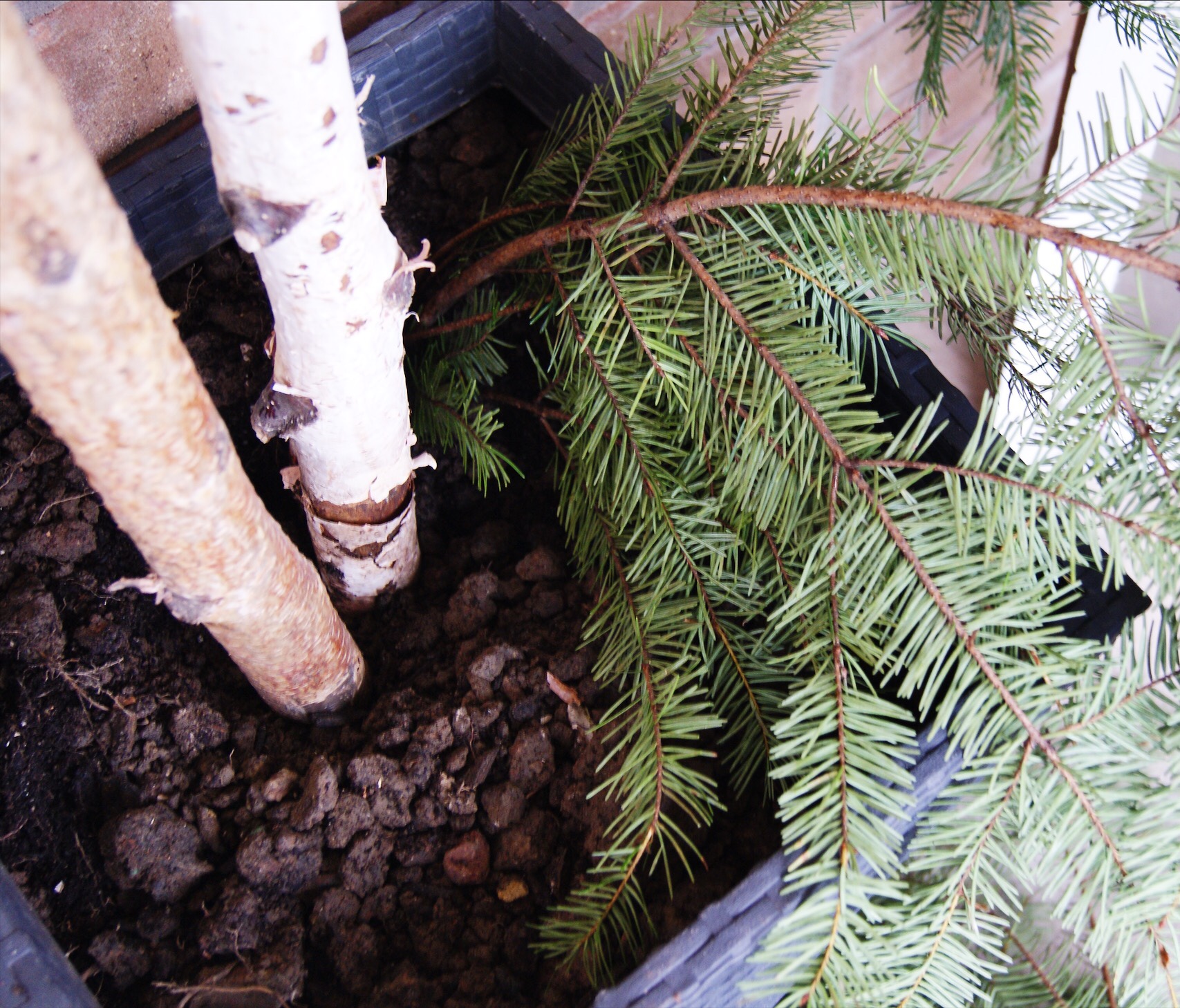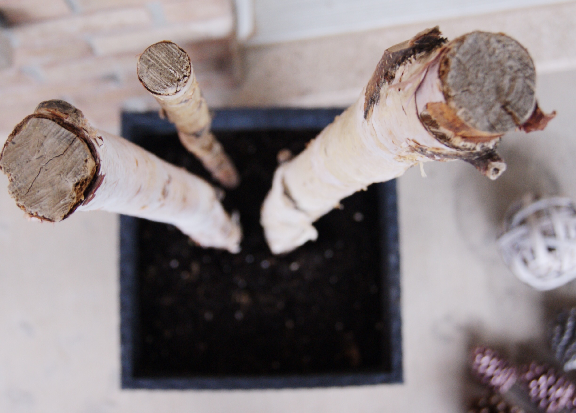 The birch sticks are the visual anchor of the whole arrangement so I use that as my jumping off point. I place them in the back half of the planter as all of the other elements will be built in front of them. My planters are against the wall so I don’t have to worry about how the back looks. If the backside of your pots will be visible, place your high elements more in the centre so you have space to add greenery all the way around.