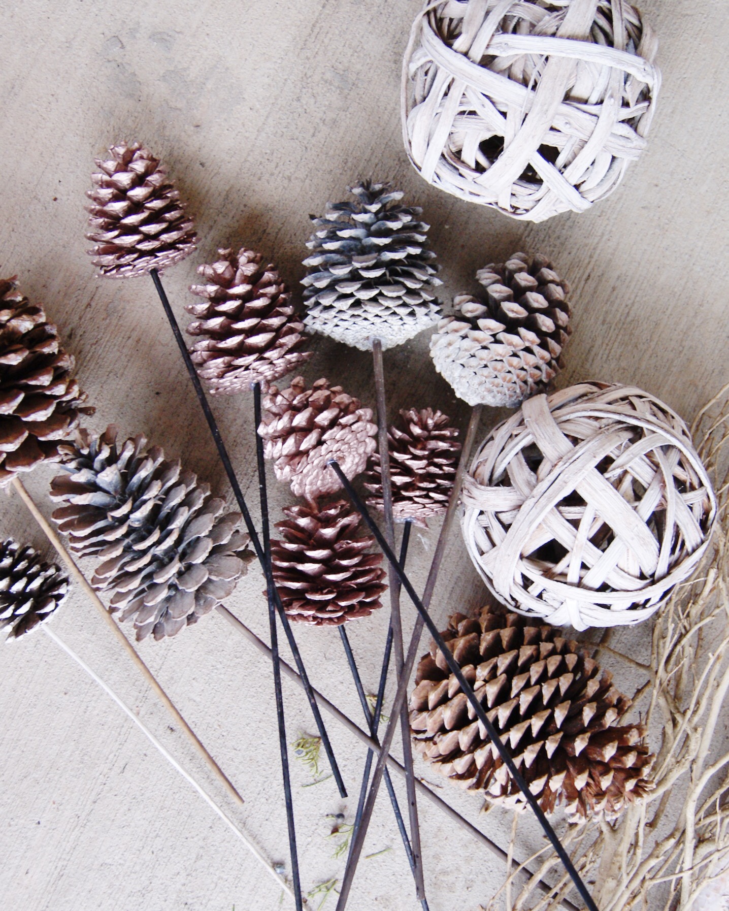 Decorative accents: Be creative! Pinecones, balls, wildlife inspiration, ornaments and ribbon. It’s really helpful if you can find things that have a stick attached so that they can be secured into the soil