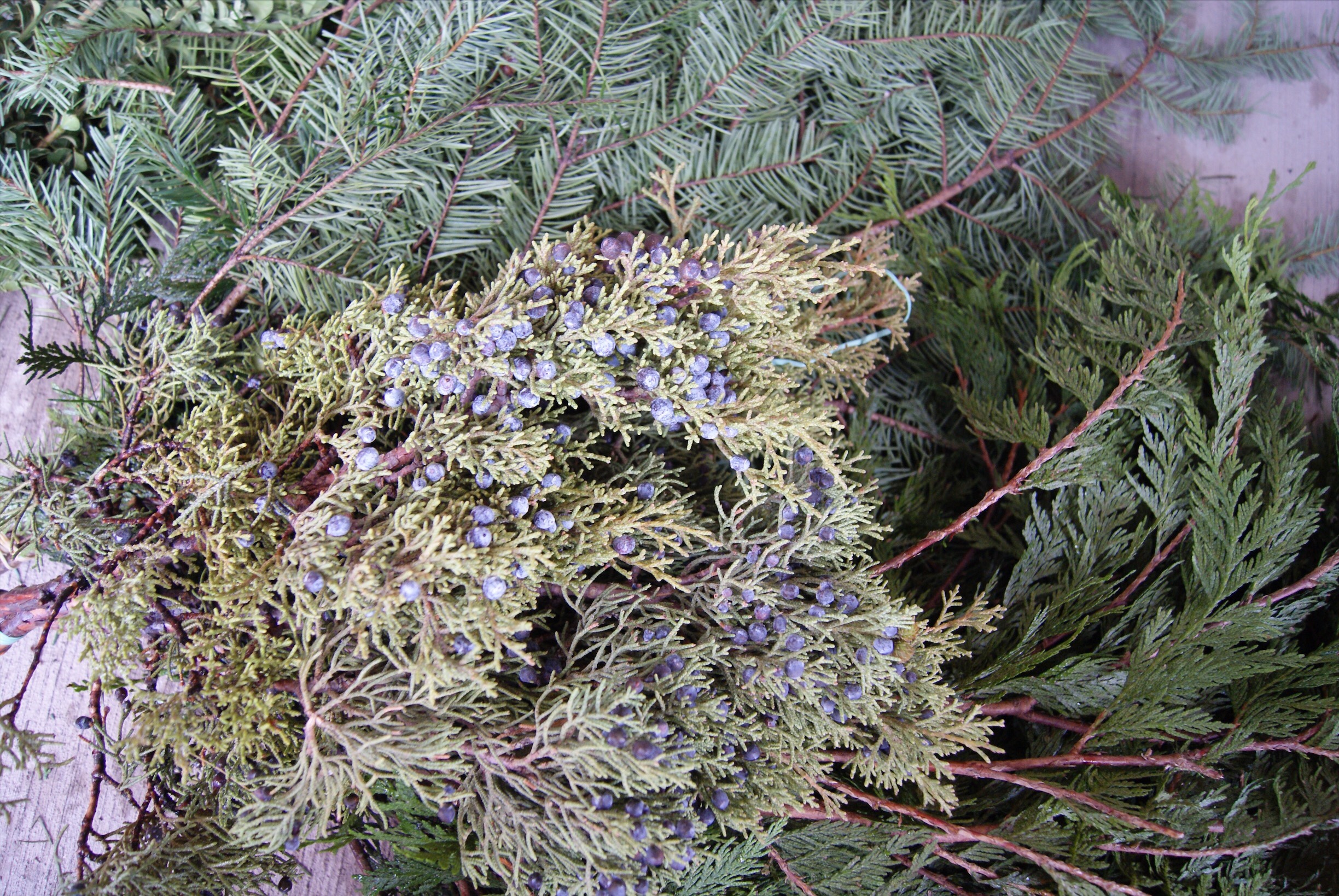 Greenery: cedar is a must, pine, juniper, fir varieties, boxwood, euonymus and more will all work. Usually sold in bunches. This year I bought 4 bunches of 4 varieties and split them.