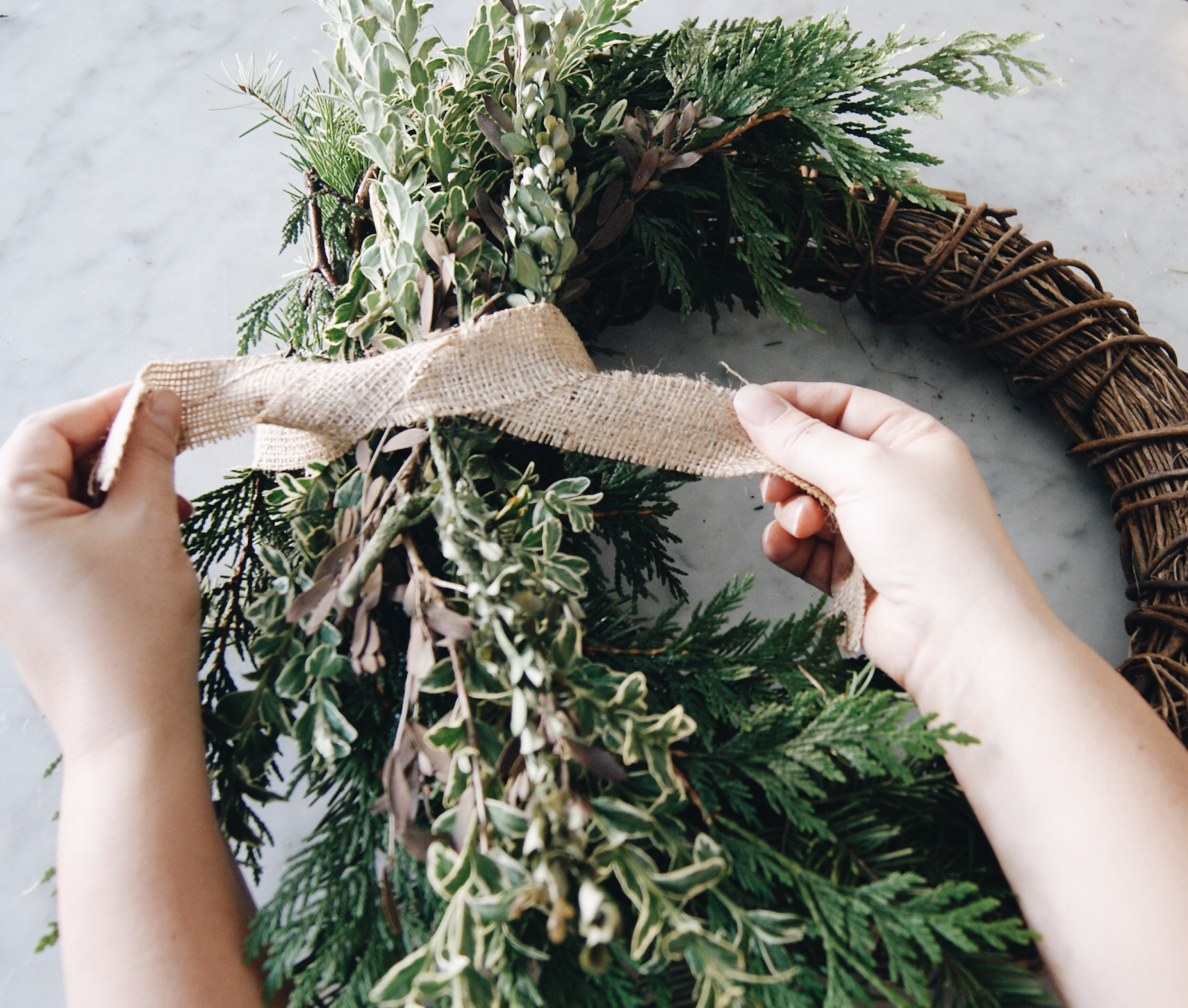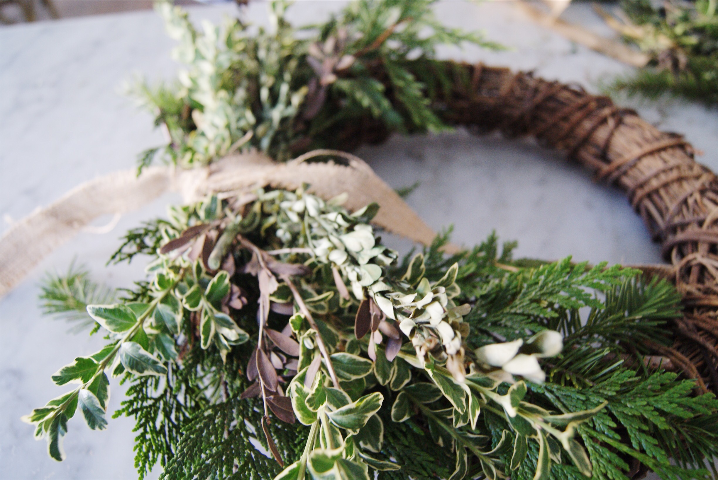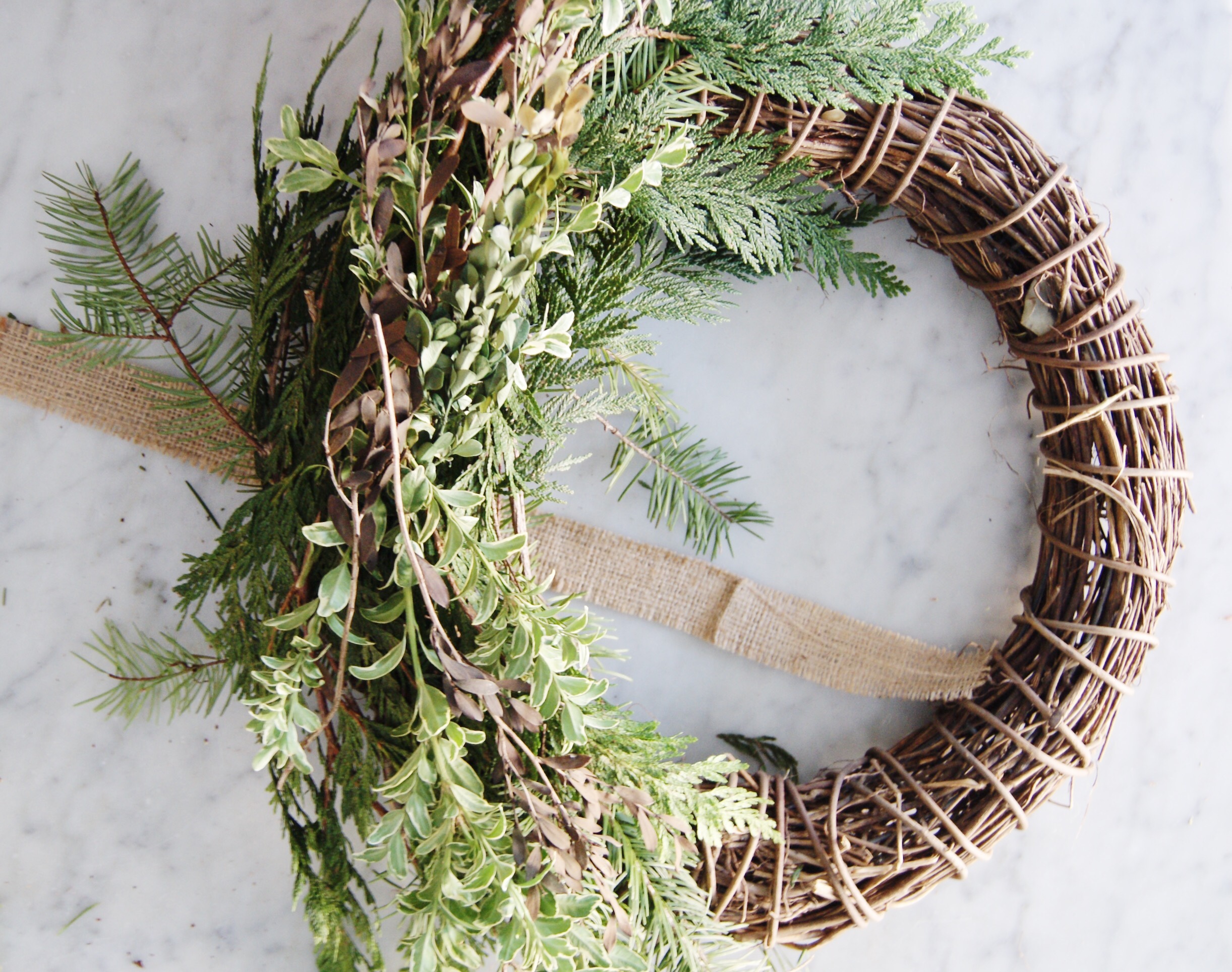 Repeat with the rest of your fresh greens. I only used the fishing line to attach my first layer of greenery. I laid the remaining branch in the same way and secured them tightly to the wreath with the ribbon.