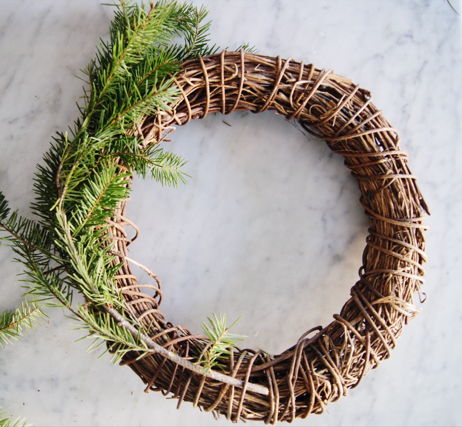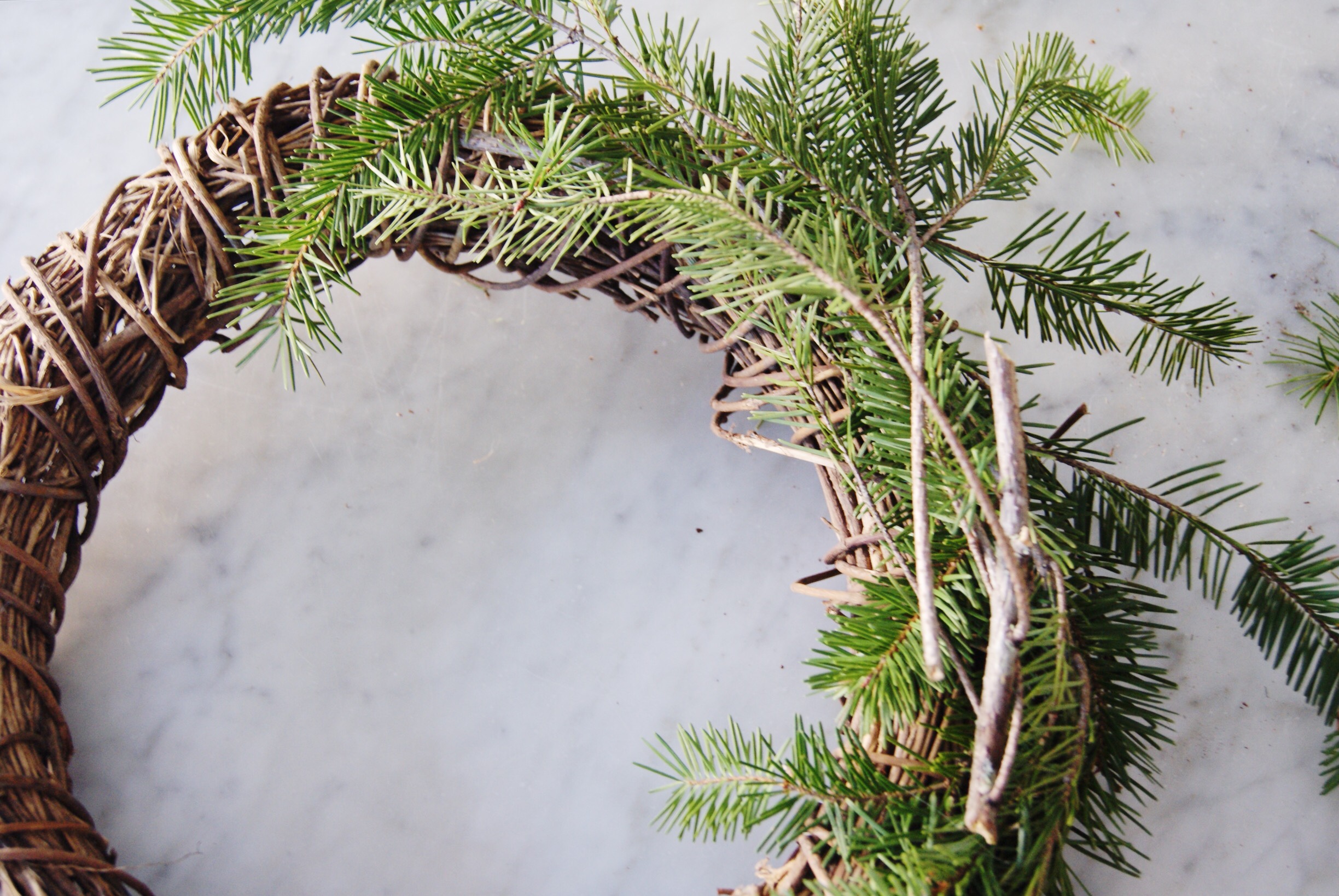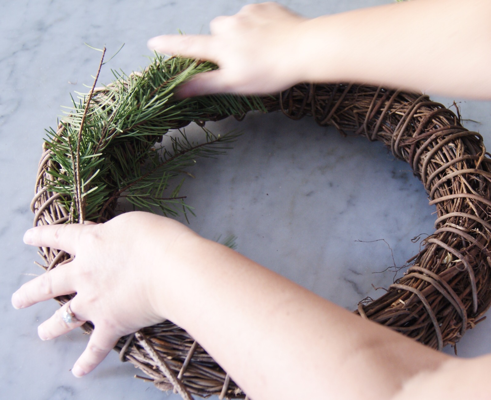 Lay your first branch curving it to the shape of the wreath. I used fir branches for the bottom and because they were ‘wide’ I wrapped fishing line around them to secure them to the base as well as to maintain a defined shape. After you’ve positioned the first branch place the matching branch in the opposite direction so that the bottoms of the branches overlap.