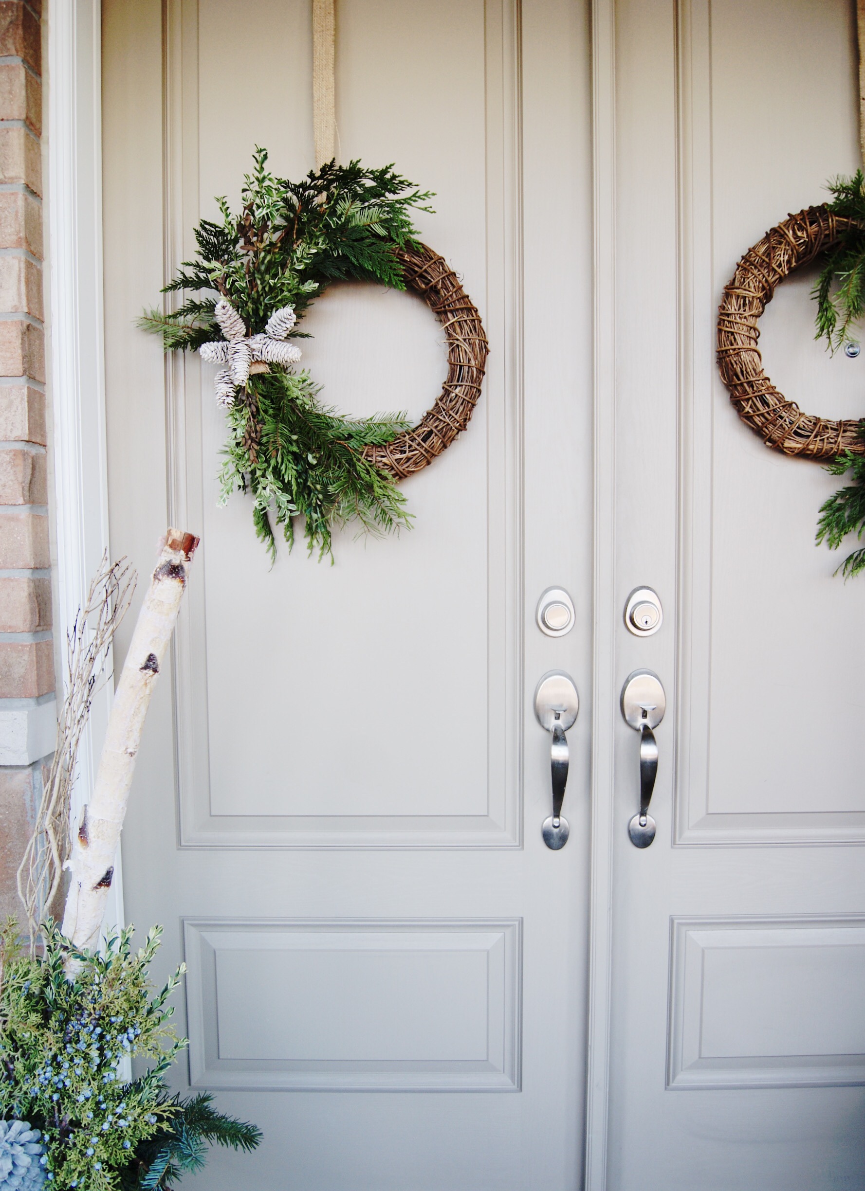 Now that my planters are complete, it’s on to the doors. I’m obsessed with wreaths. Especially the ones made with fresh and fragrant greenery. They are pricey though! Using left over greenery from my winter planter project, and cheap grapevine wreaths as the base, I created chic wreathes for my front doors. This is a really easy project and took less than 30 minutes to do. When it’s time to take them down, remove all of the branches and store your wreaths for next year.