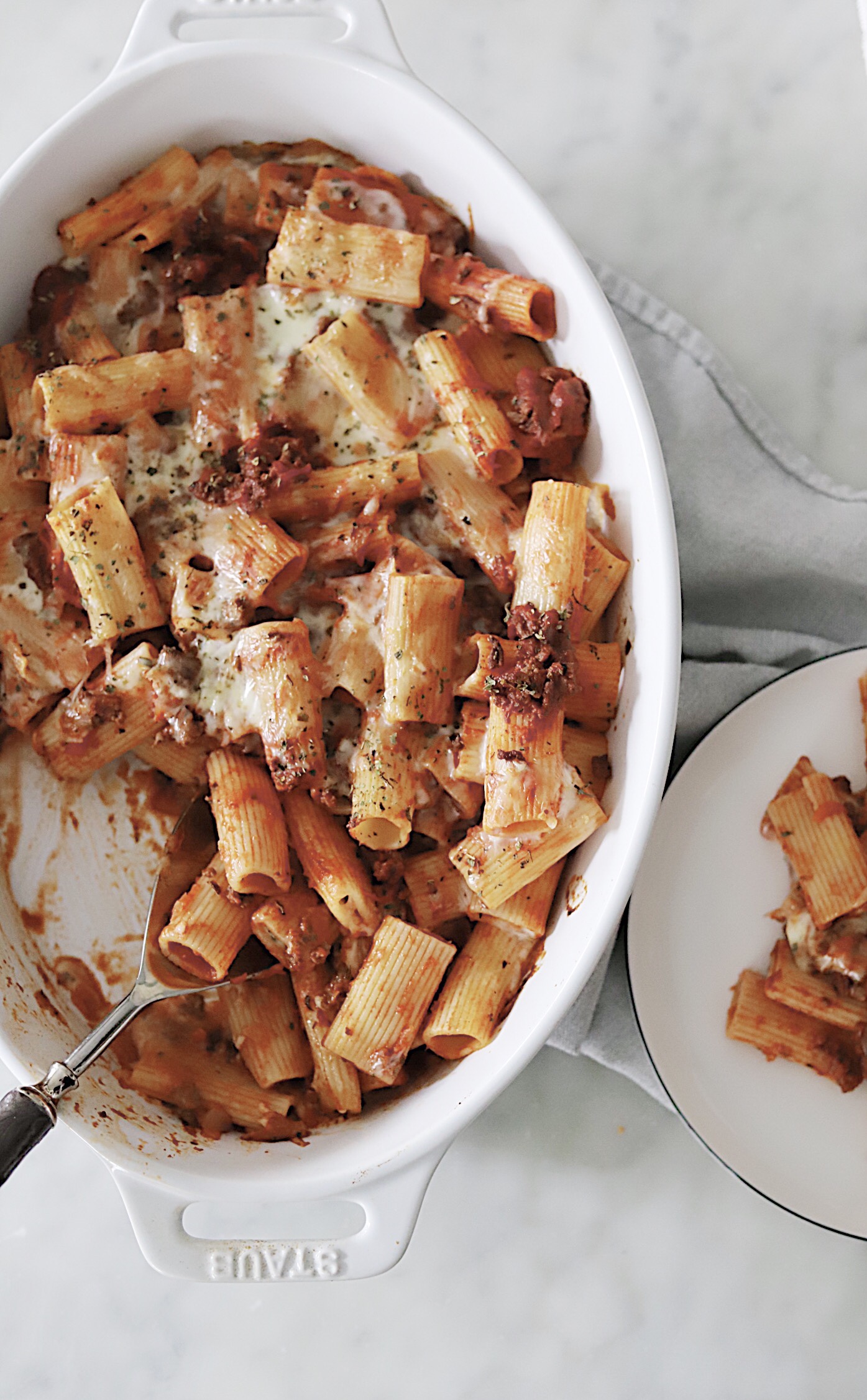 A rich meat sauce is a must for your cooking repertoire. Fast and easy but it tastes like it’s been cooking for hours. I like to sneak in a bit of cream at the end which adds a touch of richness and viscosity to the sauce. Serve it with your favourite pasta, use it as the sauce for an epic lasagna bolognese or baked rigatoni (scroll down for the recipe). For a simple dinner, we toss the hot pasta with some sauce just to coat and then add a bit more to each serving topped with some freshly grated cheese. Sauce can be made ahead and frozen.