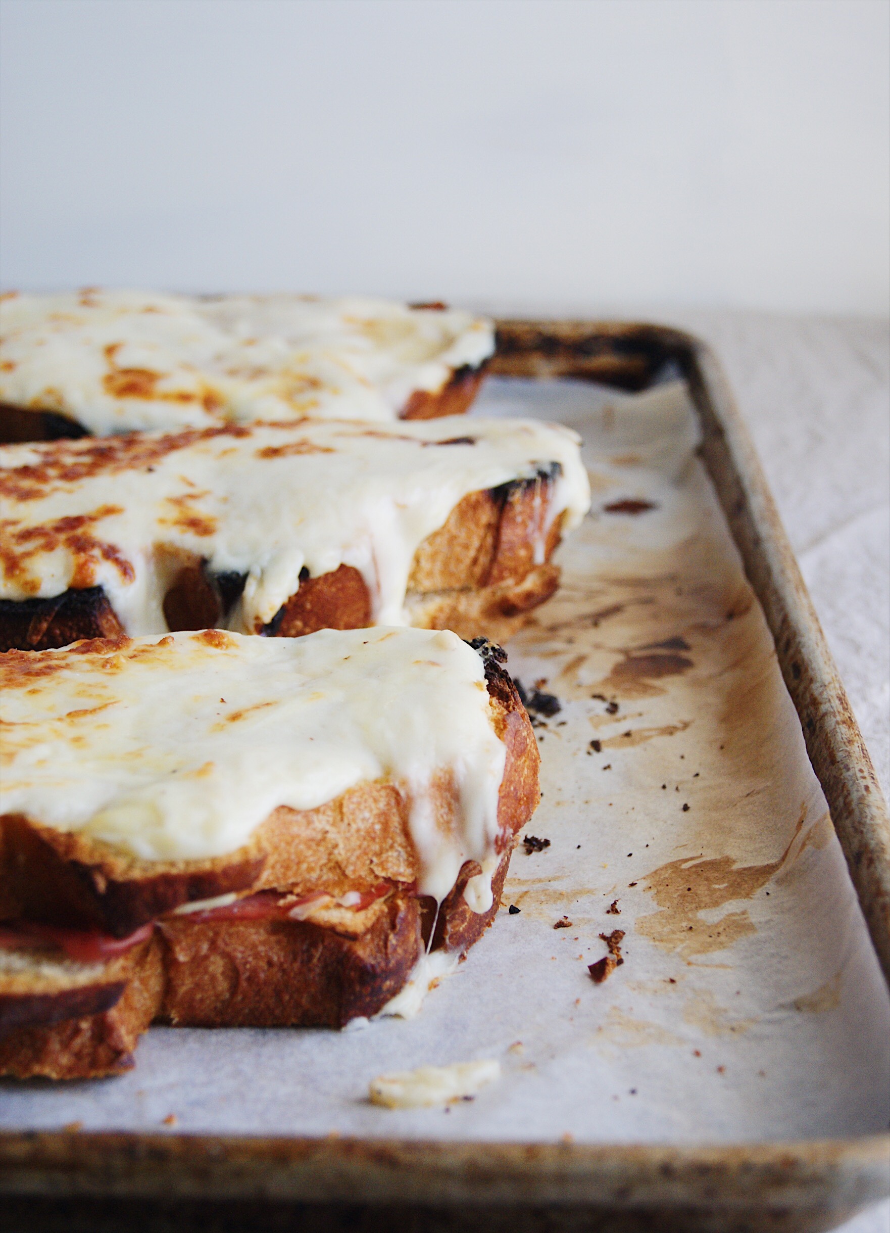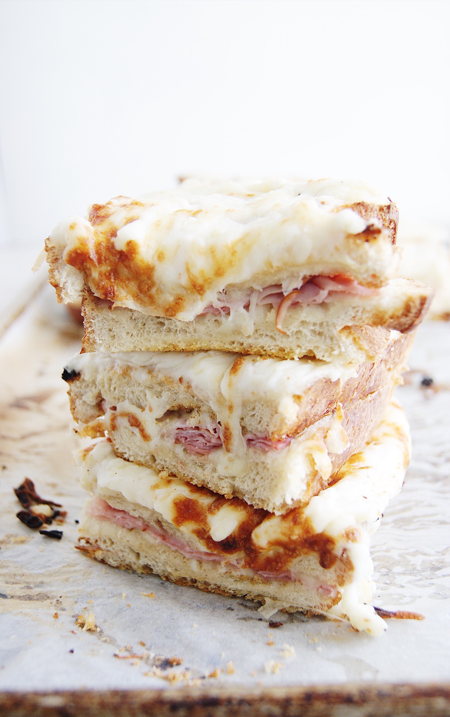 The count down is on to my first ever trip to France. I’ve been dreaming of this my whole life and I can’t wait!! I’m brushing up on some French inspired gastronomy as I will be gladly cooking for my besties in the gorgeous Provençal villa we are renting. Everyone loves grilled cheese sandwiches, and if you’ve never tried a Croque before …. it’s grilled cheese x 1000. Only the French would add rich bechamel on top of a perfectly good thing to take it way over the edge….. and of course it’s the most outrageously delicious treat. You can sub the sour dough for any dense bread you like. Add more ham, omit the ham or sub it with smoked turkey. Do whatever you please, to it as long as you keep the bread, gruyere and bechamel.