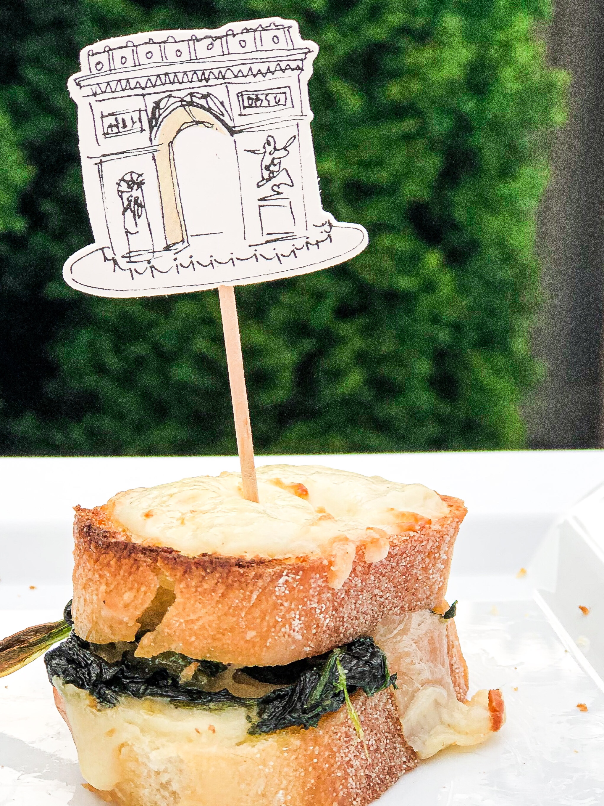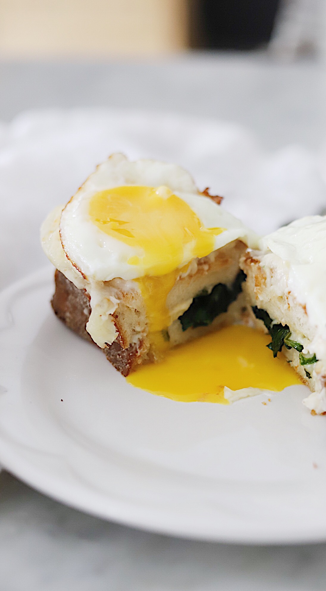I shared my croque Monsieur recipe earlier this year. A Croque Madame is essentially the same sandwich with the addition of a fried egg on top. As if the Monsieur wasn’t decadent enough with crispy buttered bread , bechamel and gruyère, a fried egg with crispy edges and a runny golden yolk take it over the edge. I’m a madame convert BUT I wanted to make a meatless version so I chose spinach as my ham substitution as it’s the perfect match to the creamy bechamel. Guys the result was sooo good. Really really good. This is my new brunch go to. For mini spinach Croque monsieurs scroll down.