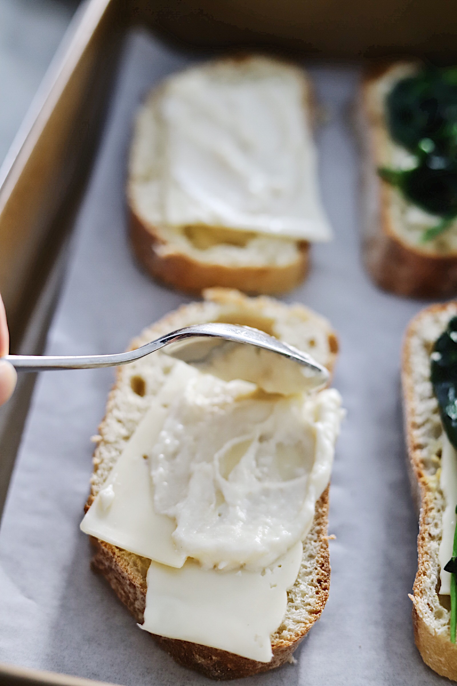 Lay half of your buttered bread slices on the pan. Spread a very thin layer of Dijon on each slice. Sprinkle each slice with approximately 1/3 cup of cheese, top with spinach and another 1/3 cup of cheese. Place remaining buttered slices on top of the sandwiches.