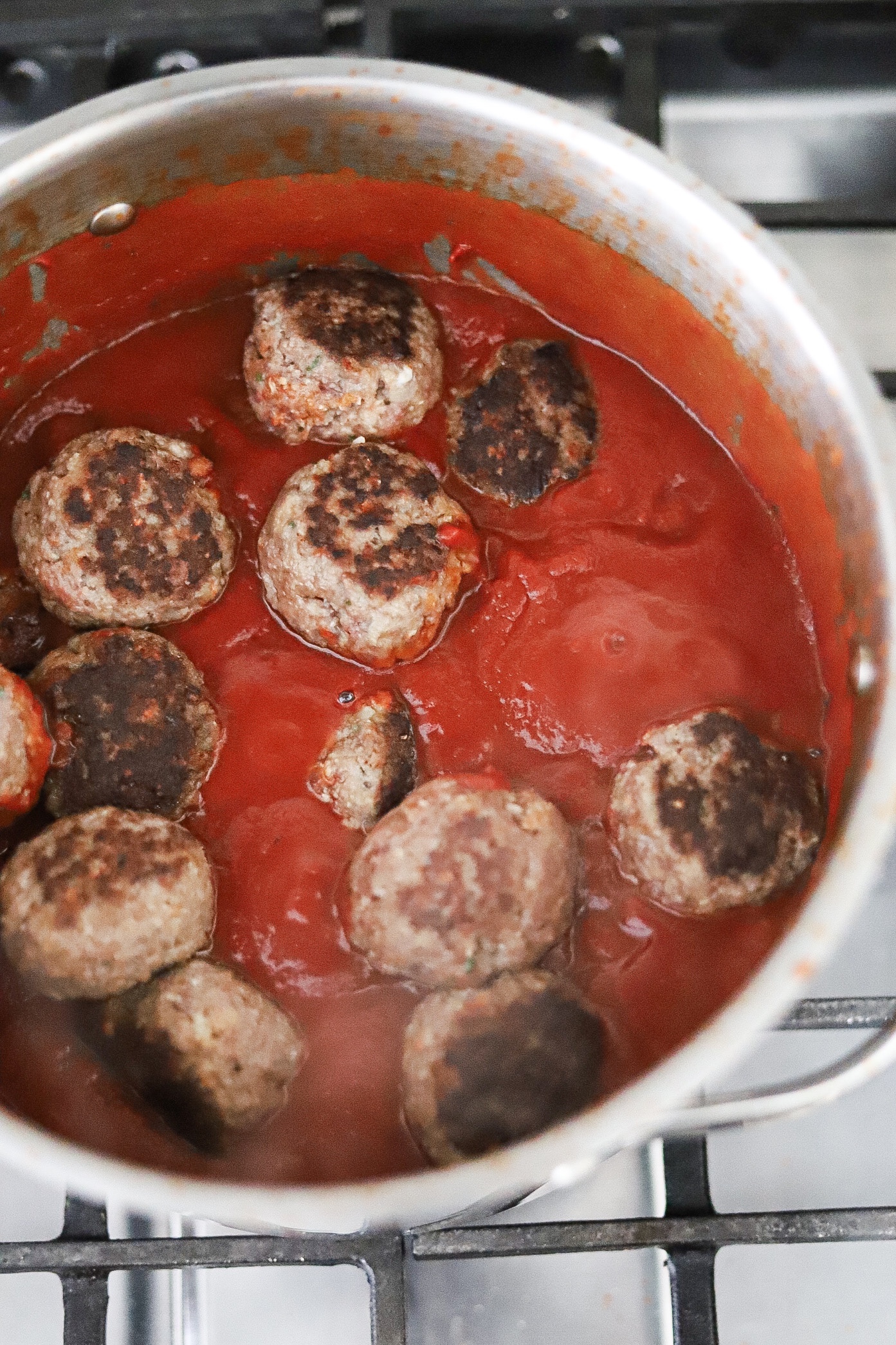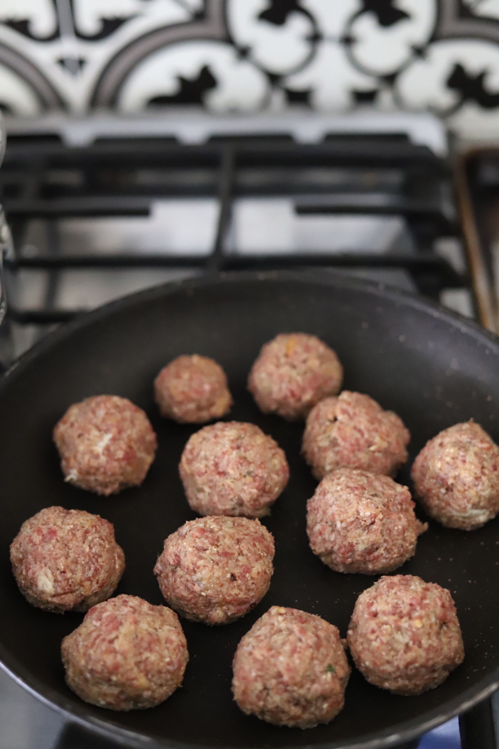 Add all meatball ingredients including soaked bread into a mixer ( mix with paddle attachment for about 20 seconds on medium speed.I prefer this method) OR you can use your hands to incorporate all of the ingredients well. You may find the mixture slightly wet or sticky (that’s good). You can set your hands to make it easier to handle. Form mixture into balls. I usually make them slightly larger than a golf ball which yields approximately 24 good sized meat balls. You can go bigger or smaller.