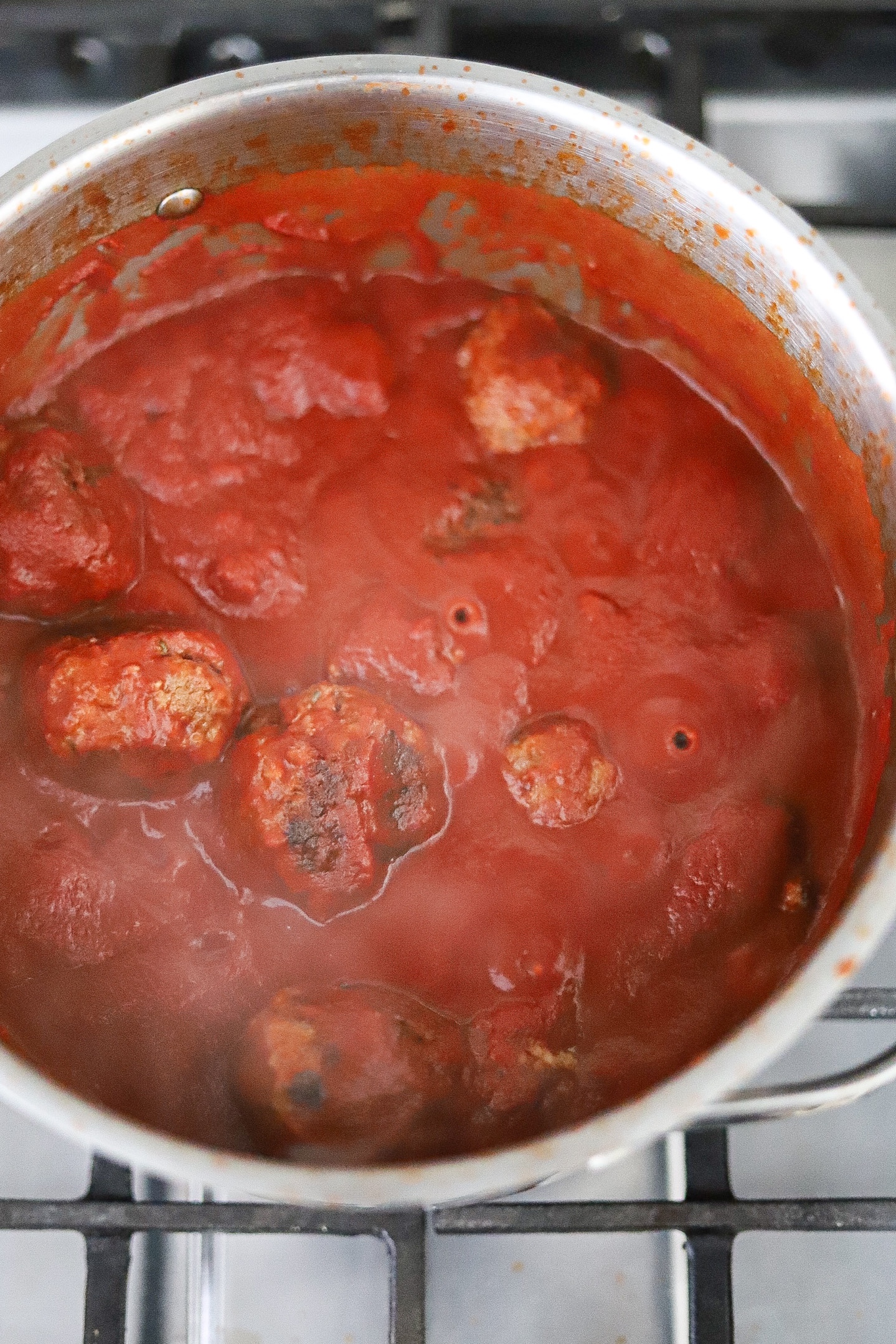 Heat a non stick frying pan on medium heat. Place meatballs in the hot pan and brown on all sides (about 5 minutes). Don’t cook them through. When they are brown gently drop them into the sauce which should be bubbling and hot. Once all of the meatballs are in the pot with the sauce, carefully stir so that all of them are covered by the sauce. Reduce heat to low and simmer for 30 minutes. Serve with you favourite pasta. Can be made and refrigerated for 3 days.