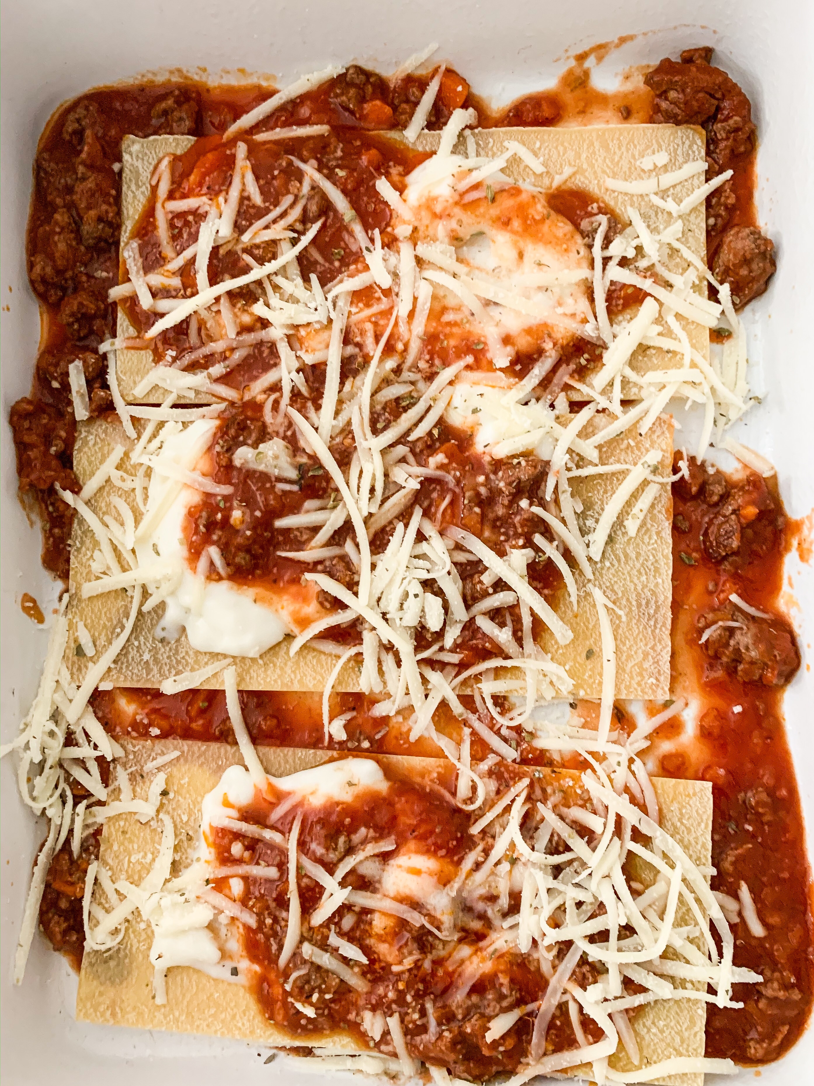 Grease a 9 x 13 baking dish with cooking spray. Spread 1/2 cup of the meat sauce evenly on the bottom of the baking pan. Layer your lasagna sheets(3-4) to cover the bottom. Add another 1/2 cup of sauce, 1/2 cup of bechamel, 3/4 cup cheese mixture. This will be your formula for each layer of your lasagna. On top of the last layer of pasta noodles spread the remaining meat sauce , then bechamel and top with remaining cheese. *tip: If you find you need to stretch your tomato sauce simply add a bit of water to it. Bake uncovered for 45 minutes. Let lasagna rest 15 minutes before serving.