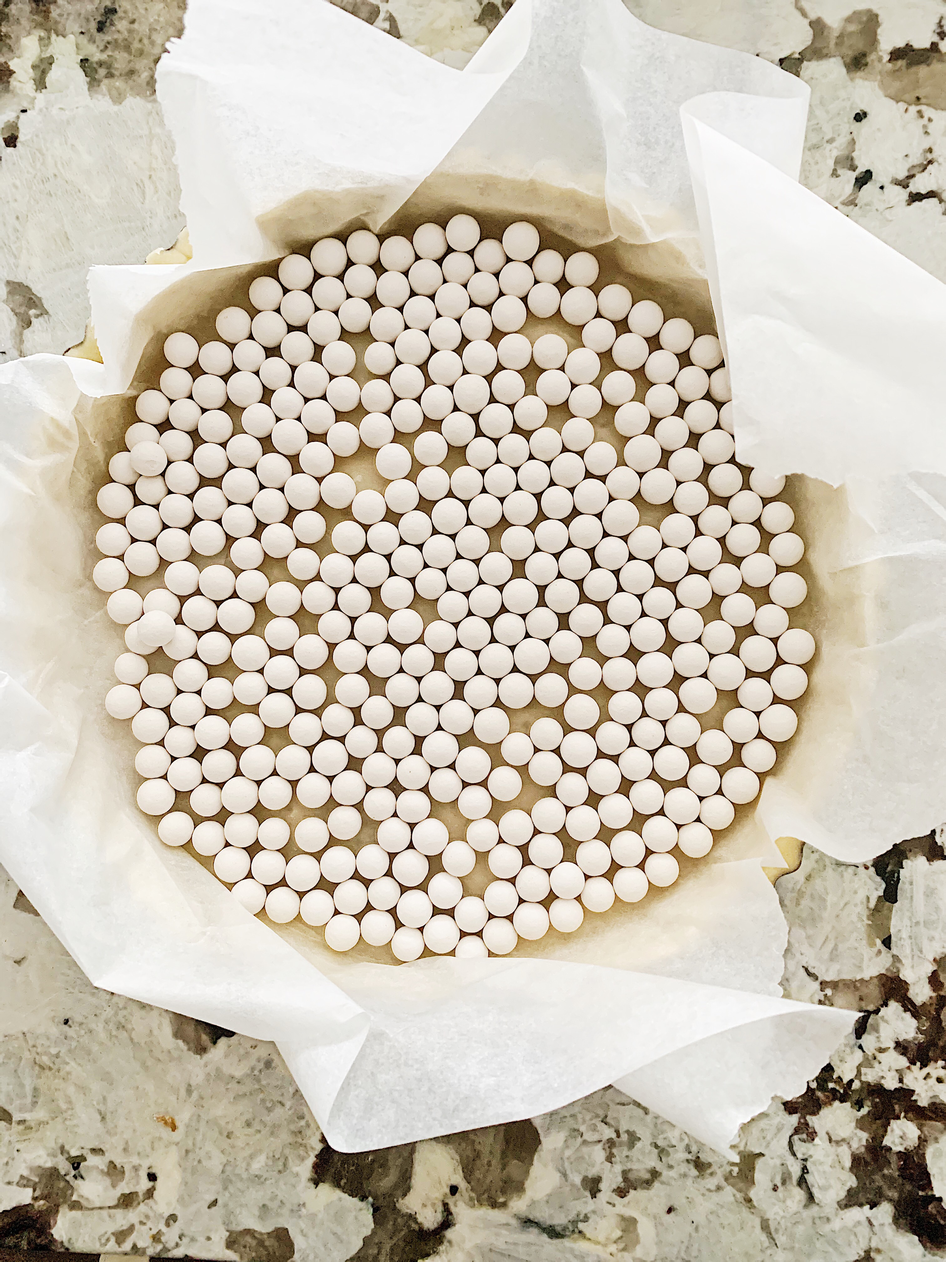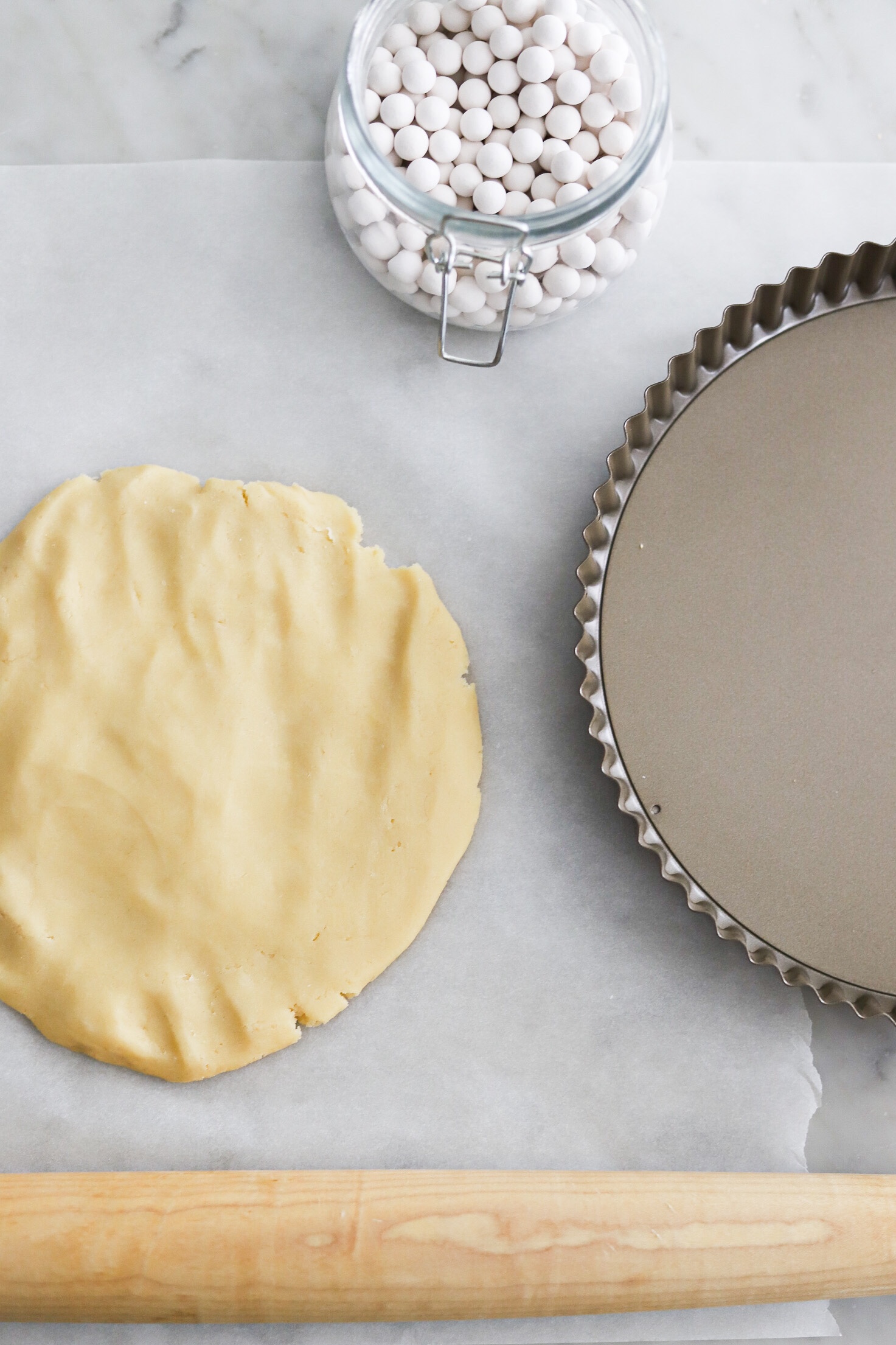 Place dough between 2 pieces of parchment paper and roll it so it will fit into your pan including the sides. Gently press the dough into the pan and use a knife to cut off any excess at the sides. Poke holes on the bottom with a fork. Lay a sheet of the parchment on top of the crust and fill it with pie weights. Bake for 30-35 minutes. Let cool completely before adding your filling.