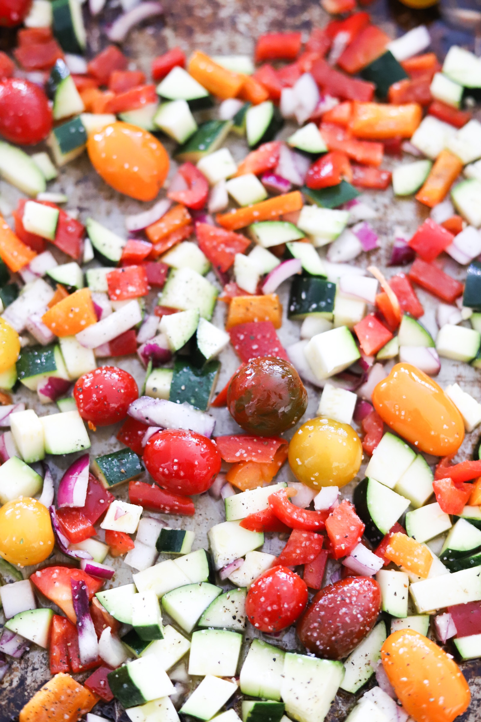 Preheat oven to 375 degrees. On a large sheet pan toss all veggies well with 2 tablespoons of the olive oil, 1 teaspoon kosher salt, oregano and freshly ground pepper. Spread out evenly and roast for 25-30 minutes.