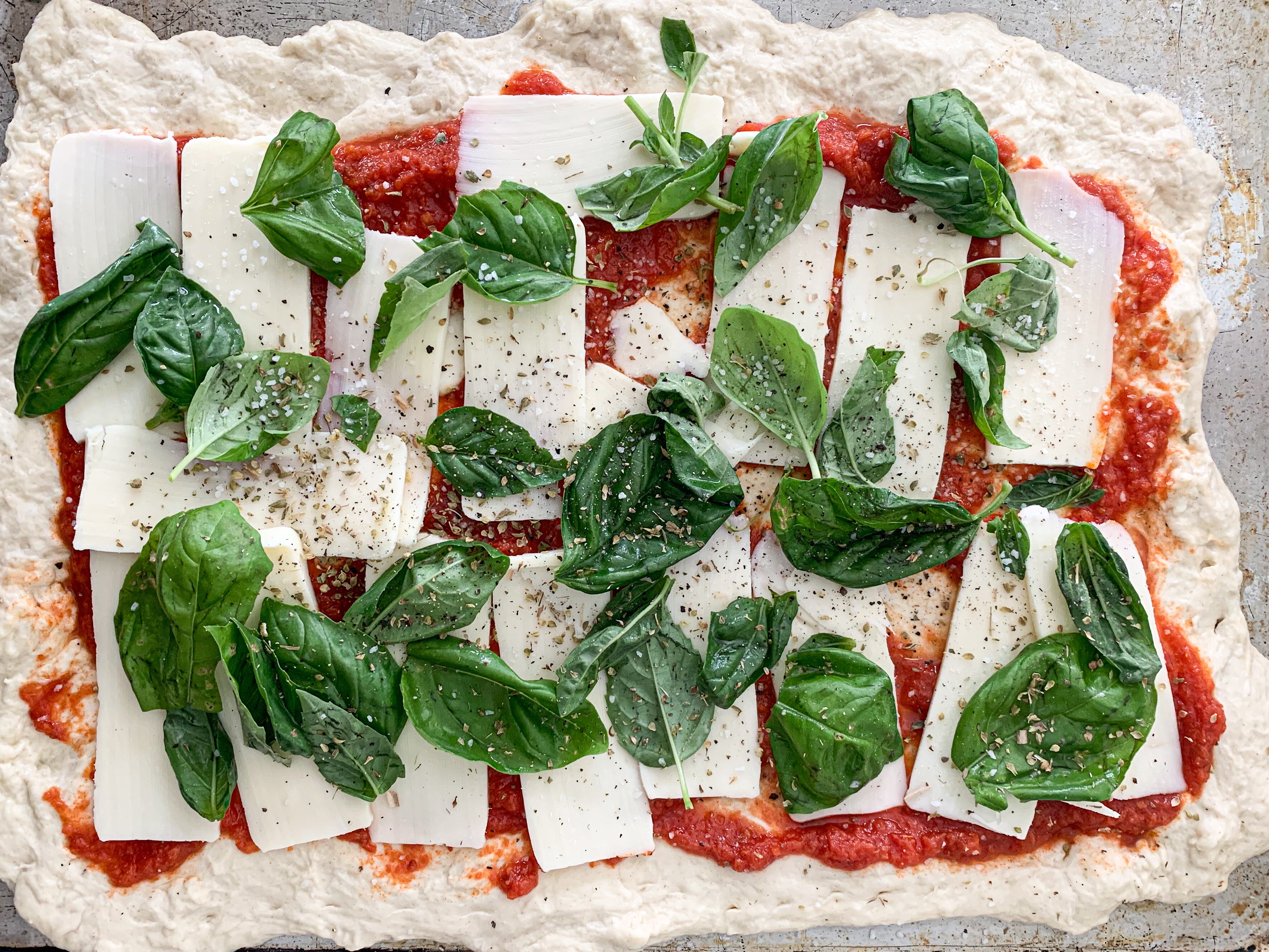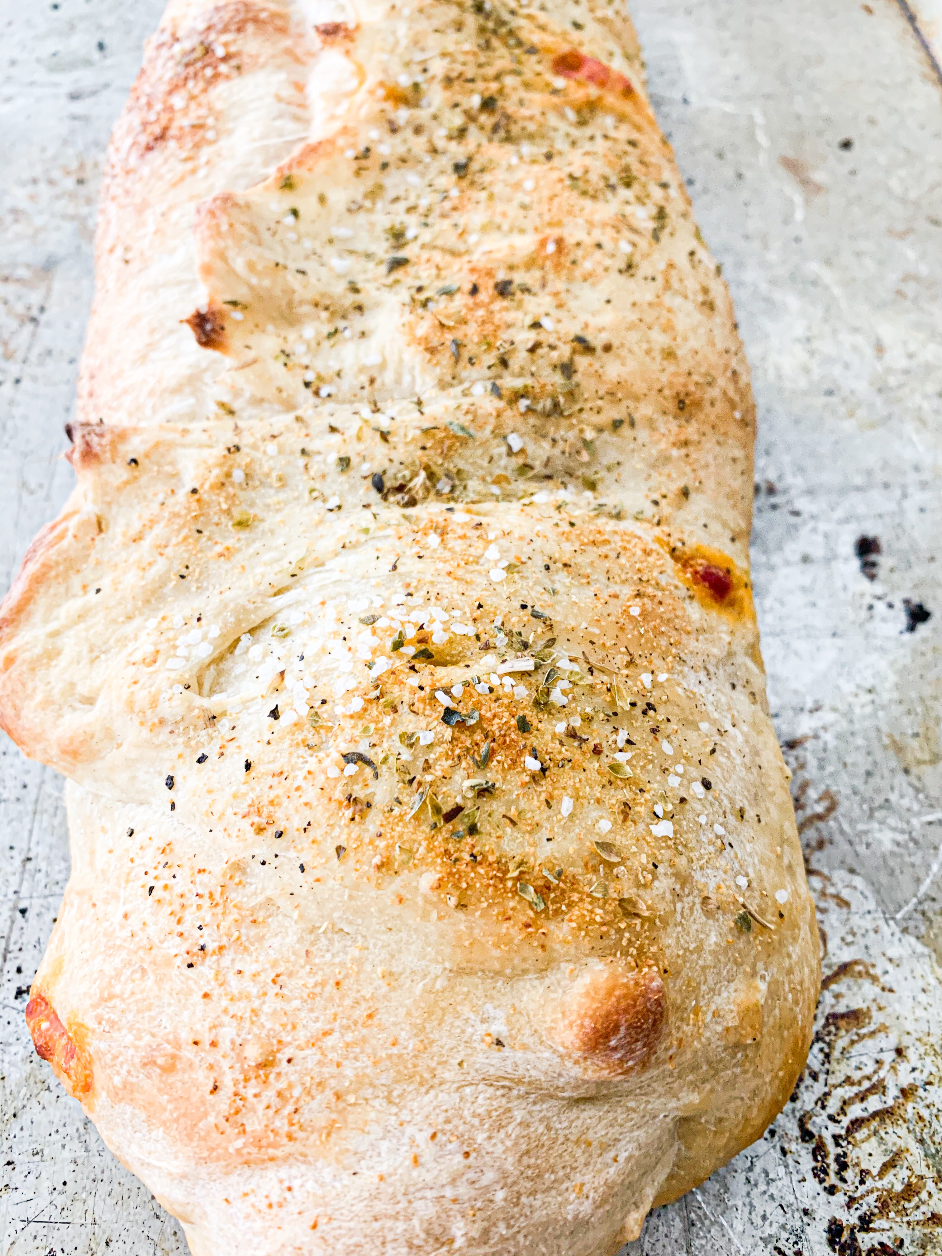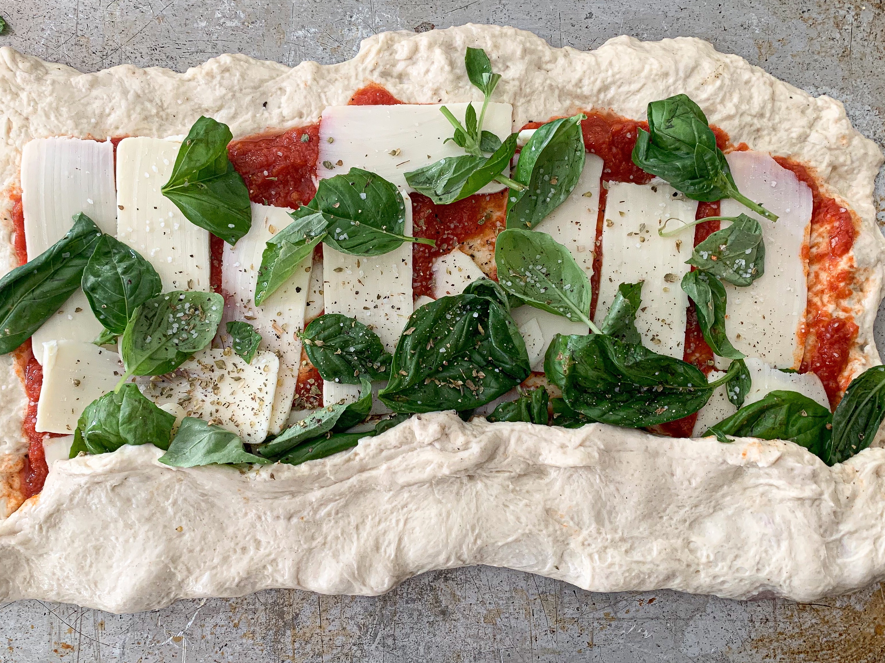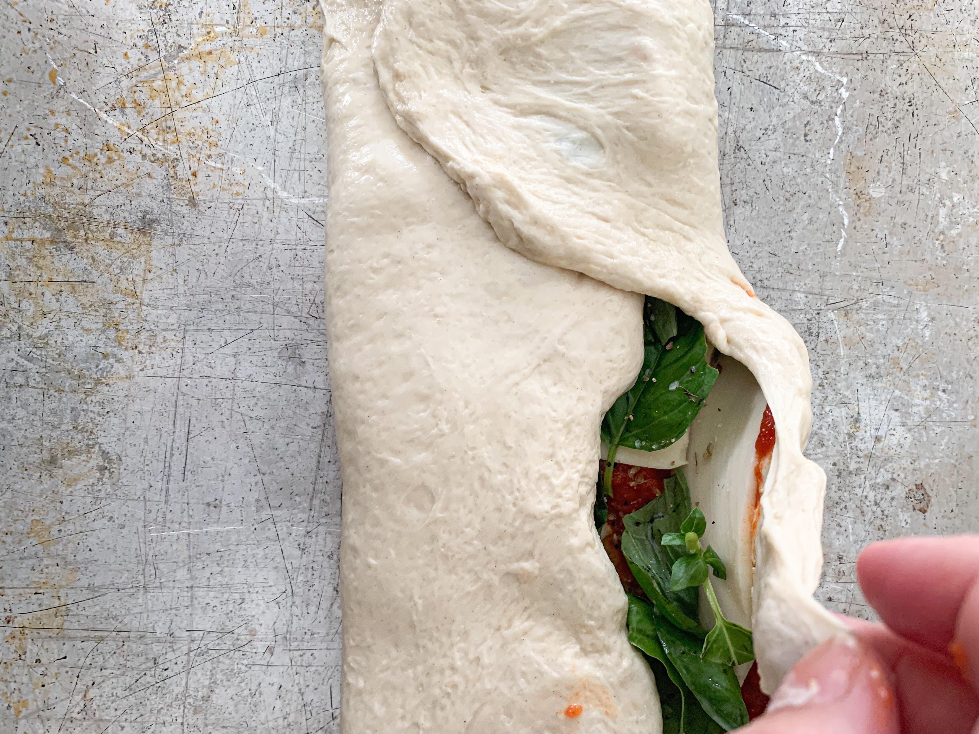 Layer your toppings evenly leaving a one inch border around the sides. Sauce is optional but go light. Think cheeses, deli meats, roasted veggies and herbs. Gently start to roll the bottom taking care not to rip the dough if possible. If you choose to use the parchment lift it to guide the dough and gently peel it from the paper as you go. Fold the sides in burrito style, pinch and continue to roll making sure the end is closed well at the seam. If you are able flip it seam side down. Poke holes across the top with a knife. Brush with olive oil, salt, pepper and whatever seasoning you like. Bake for 20 minutes on the bottom rack. Let cool, slice and serve warm, at room temperature or chilled with or without a dipping sauce