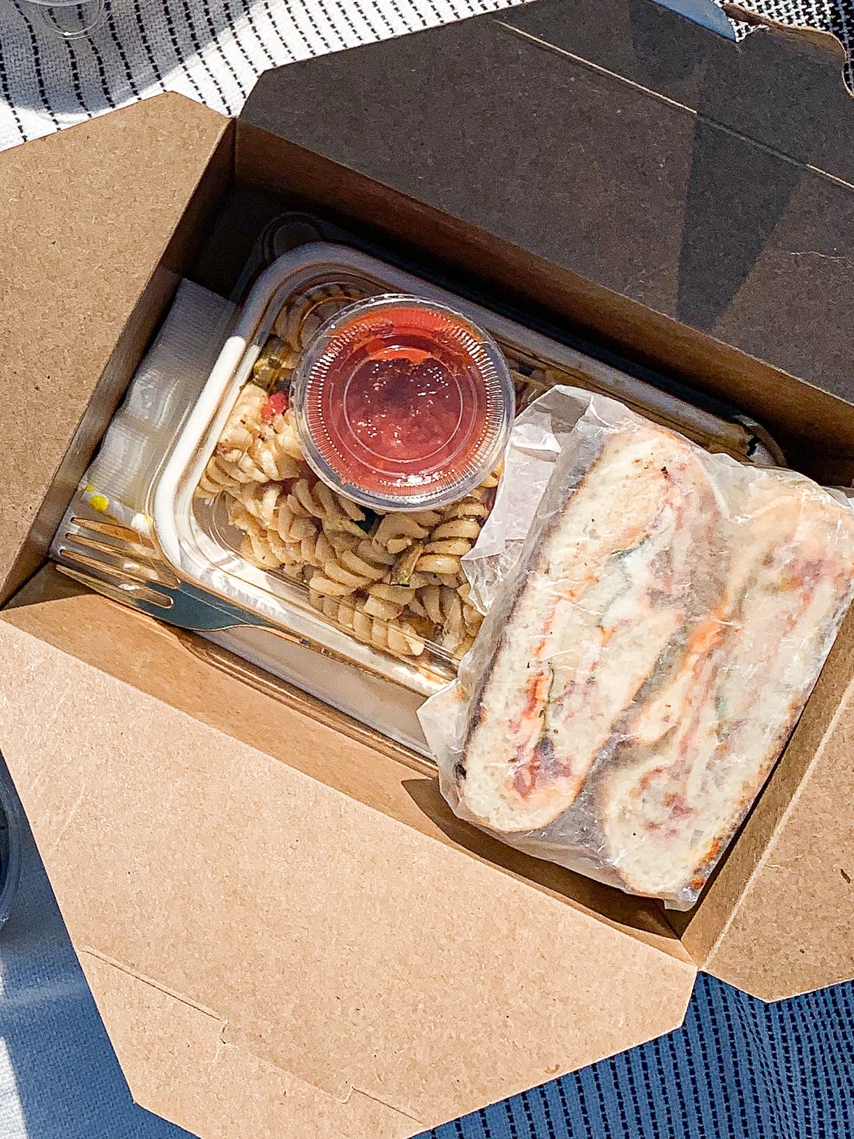 What goes in the box? Package each component of your menu separately so it can be easily grabbed and enjoyed anytime. Use recyclable disposables, wax or parchment paper or lightweight reusable containers. Add in single serve condiments, napkins, sanitizing wipes, and a paper straw. To source boxes look online for kraft take out boxes. Always make sure your food is kept in a cooler with ice or packs until you are ready to eat.