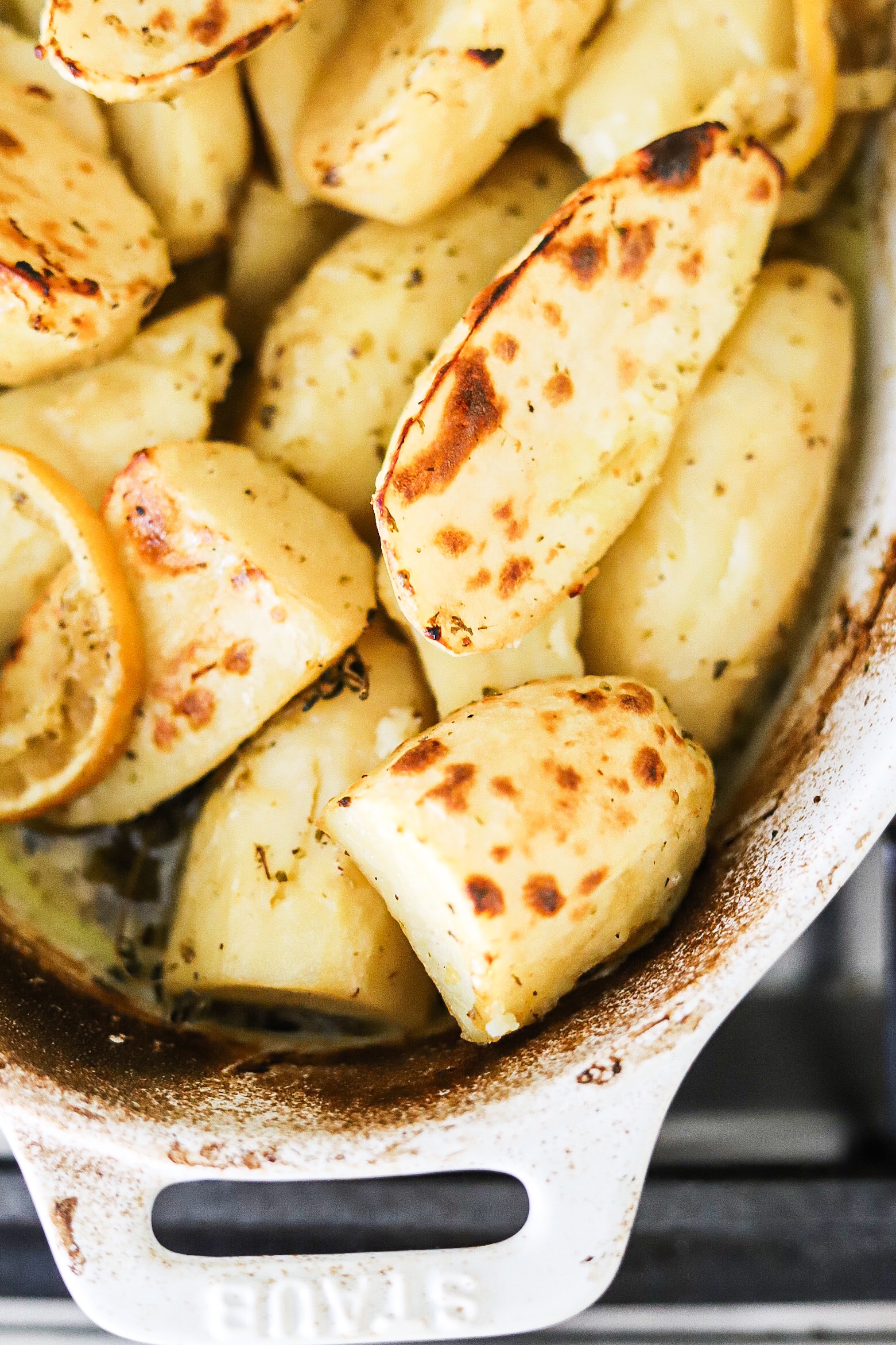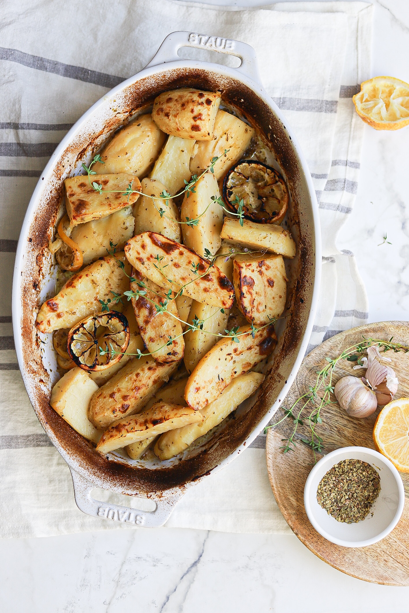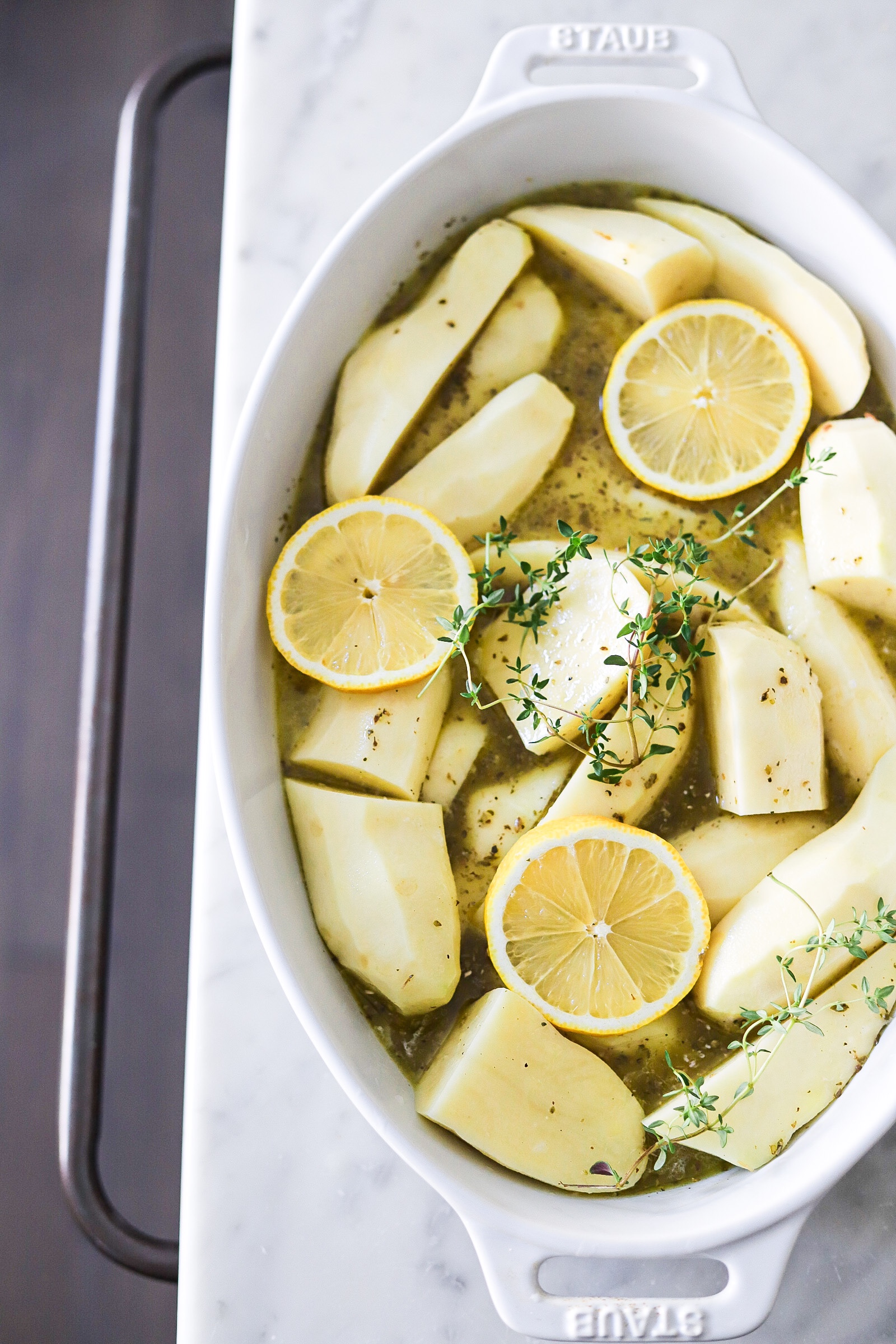Preheat oven to 375 degrees. Place peeled and cut potatoes in a bowl and cover with cold water. Combine oil, lemon juice, garlic, salt, pepper and oregano and whisk well. Drain potatoes and place in a 9 x 13 baking/roasting pan . Pour dressing over the potatoes. Add fresh thyme and lemon slices if desired. Cover tightly with foil and carefully place in the oven on the bottom rack. After 45 minutes give the potatoes a toss cover again and continue baking for another 30 minutes, remove foil and continue for 15 minute or until fork tender. If you want the potatoes to brown more at the end of cooking toss them in the reduced “sauce”. If it’s dry add a bit of olive oil, then place them under the broiler for a minute or 2 (only if you’re using a metal pan). If you baked them in a non metal pan transfer before broiling.